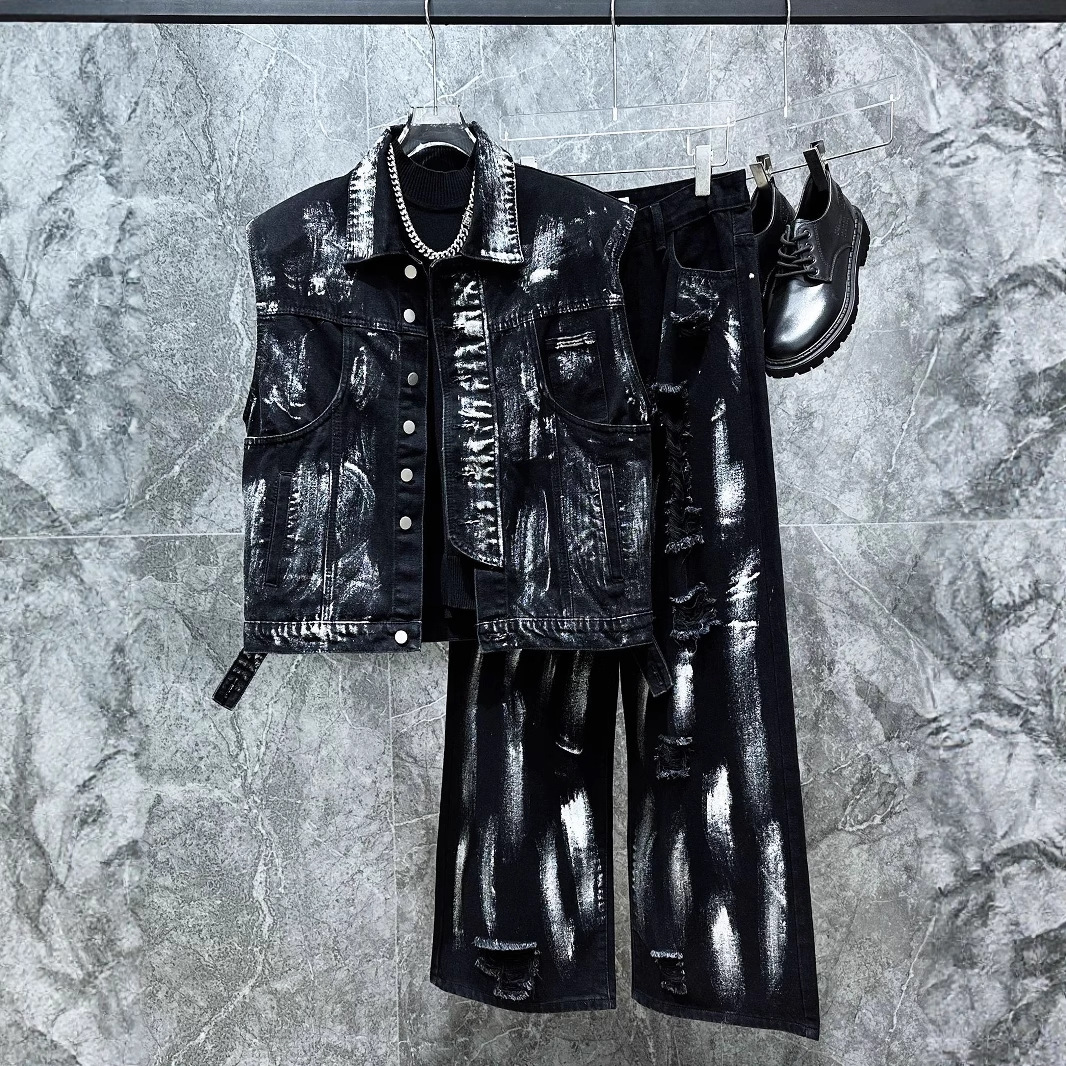 廃土風カウボーイコートセット男欧米街頭落書き水洗い穴を割ったジーンズ春秋ジャケット男