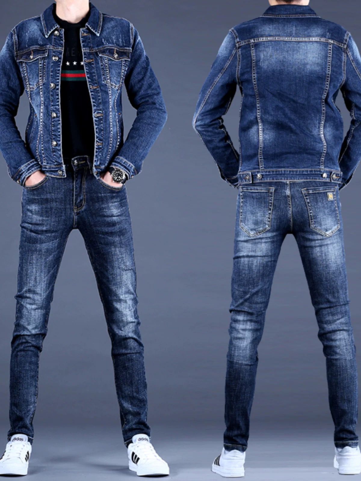 秋季男士牛仔套装潮流夹克外套休闲长裤弹力修身百搭