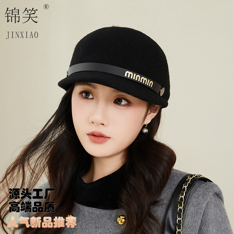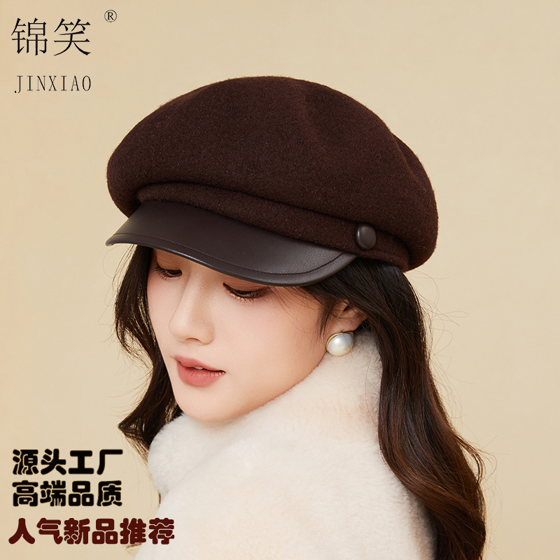 新款皮檐鸭舌帽女秋冬时尚百搭英伦羊毛贝雷帽复古保暖毛呢画家帽