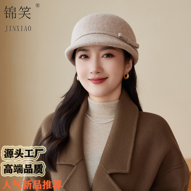 高品质花朵羊毛呢盆帽秋冬新款复古赫本风保暖帽女气质优雅渔夫帽