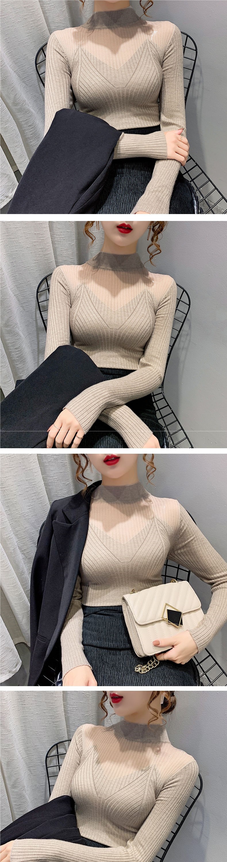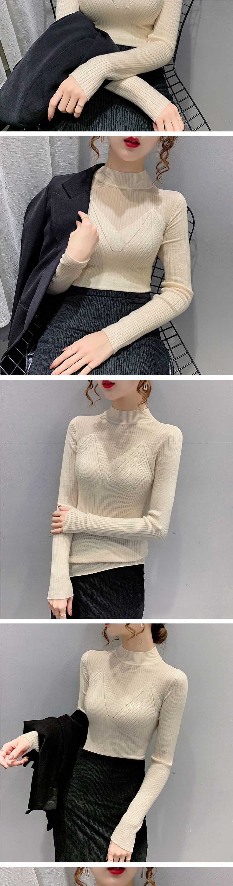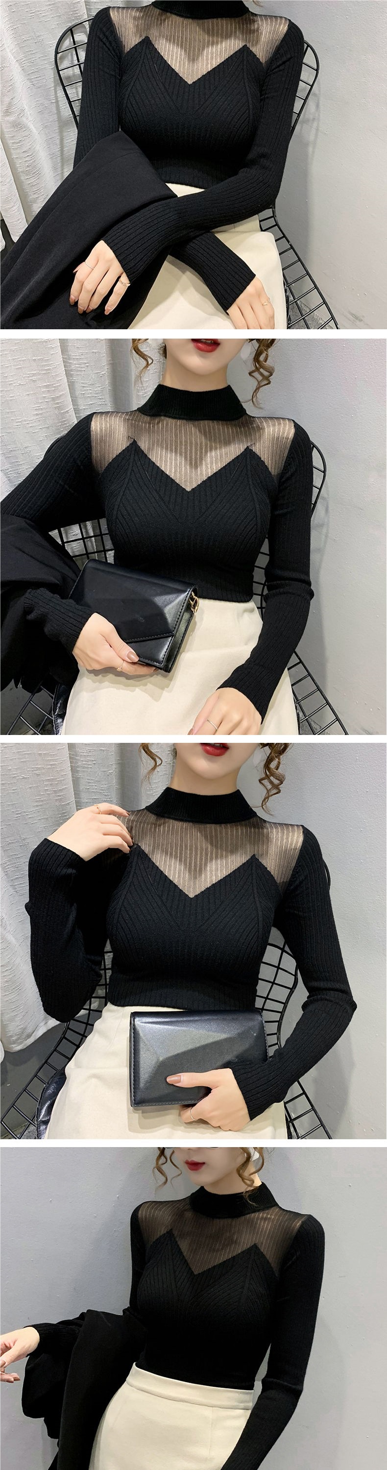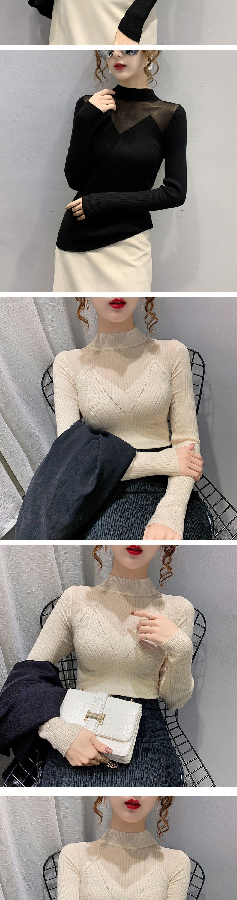 半高领镂空网纱针织打底衫女秋冬新款韩版雕花蕾丝内搭毛衣女上衣