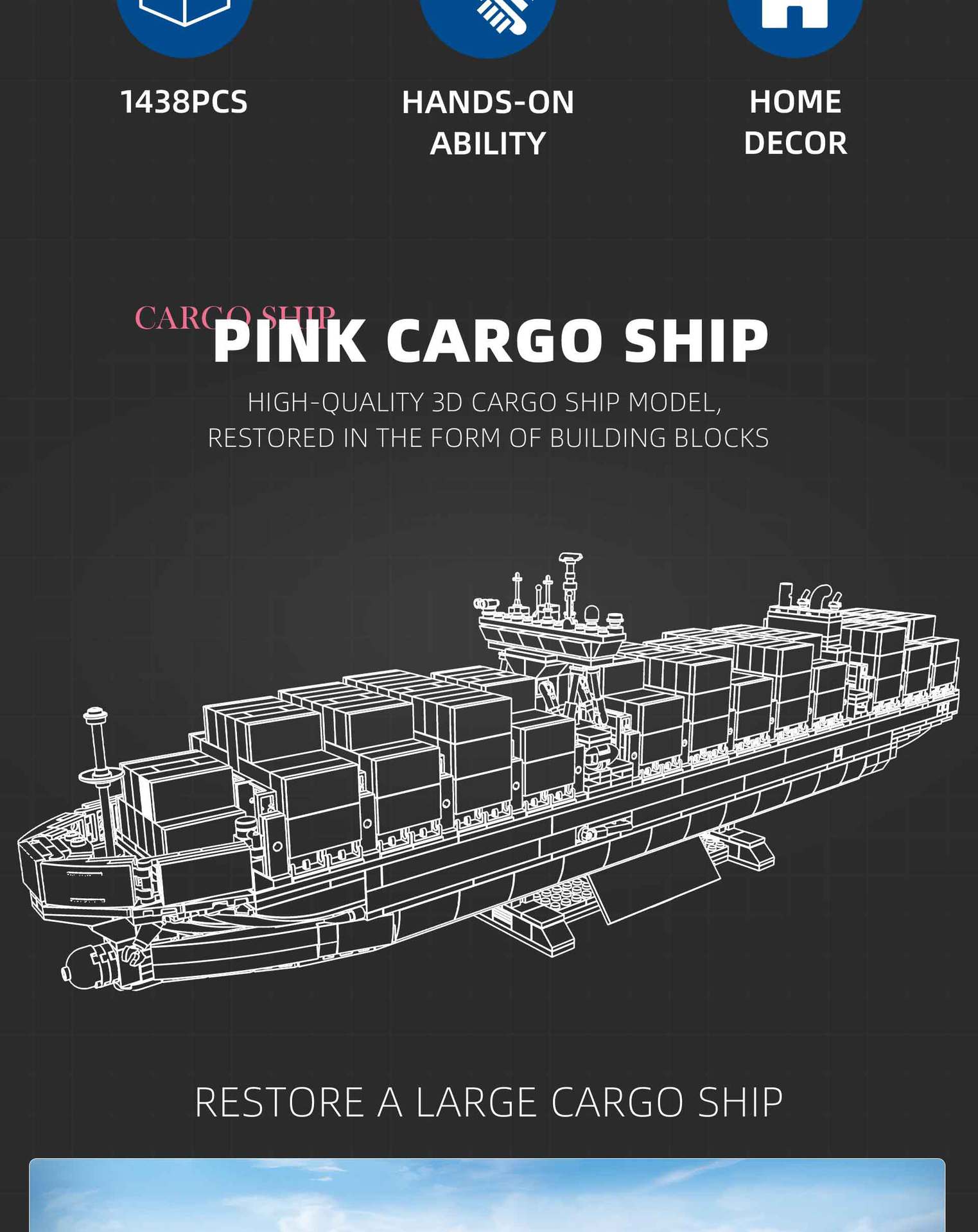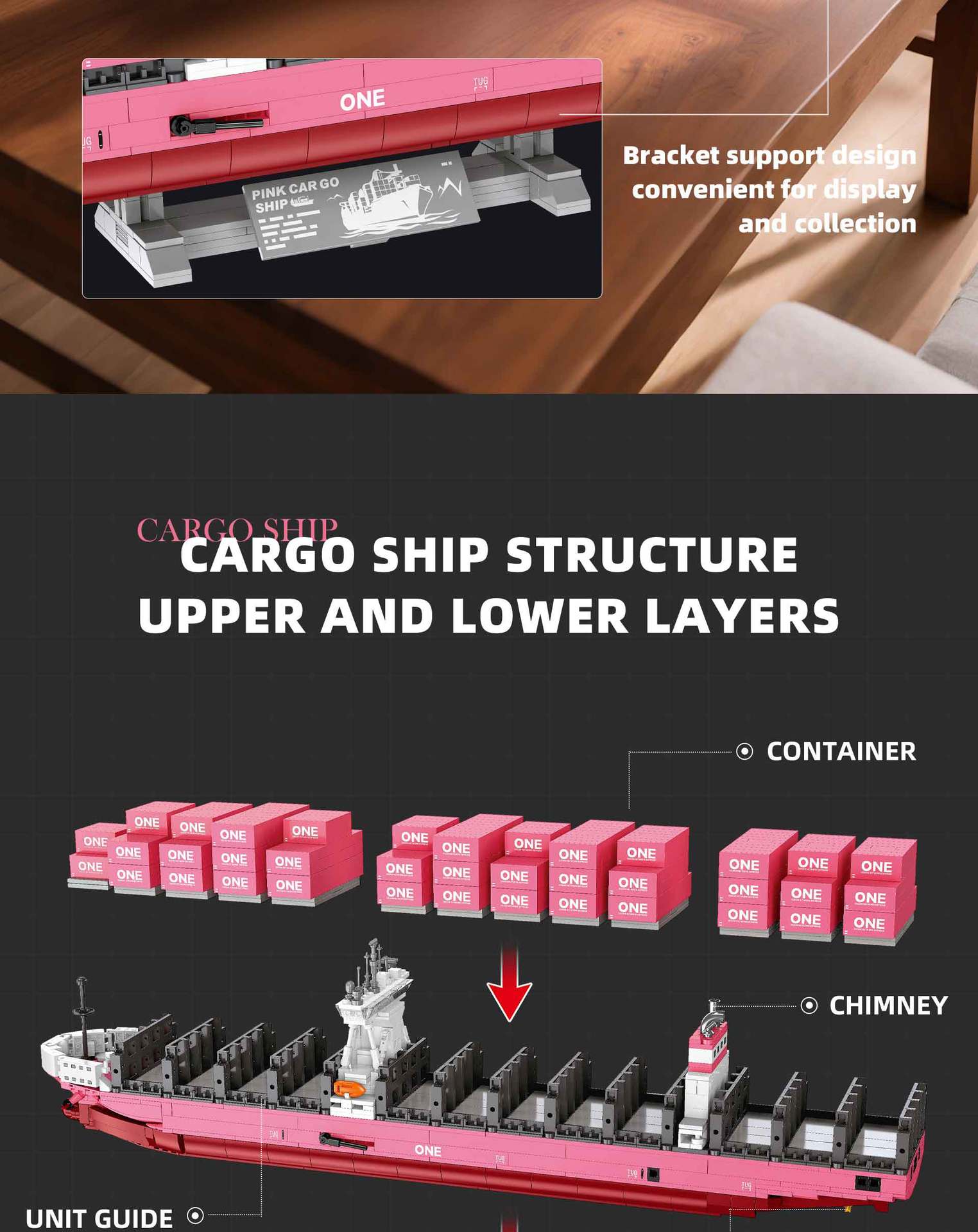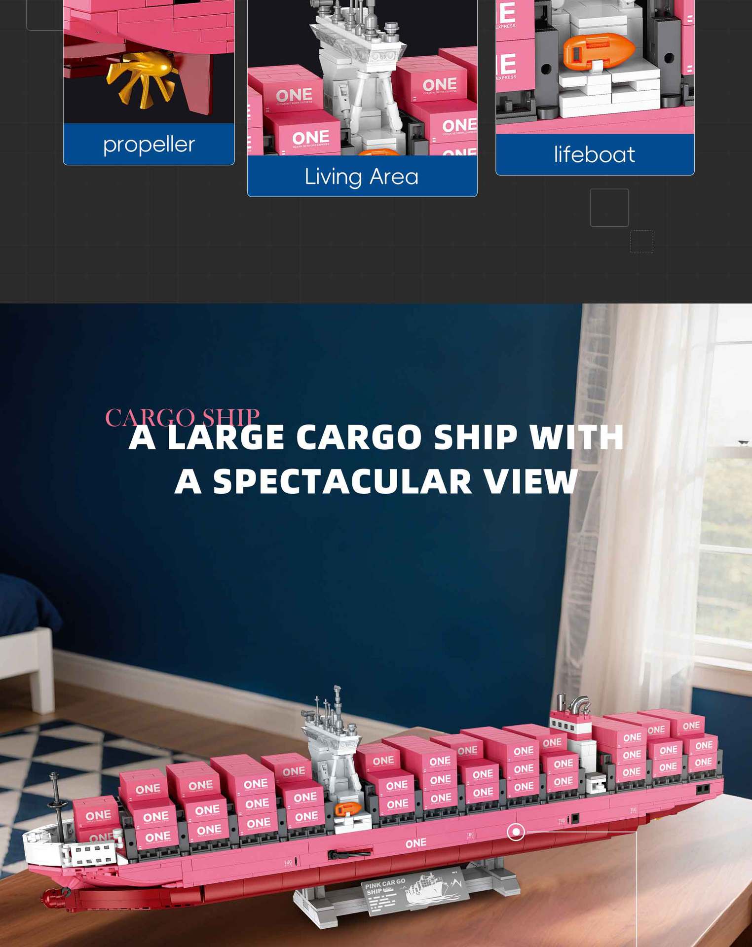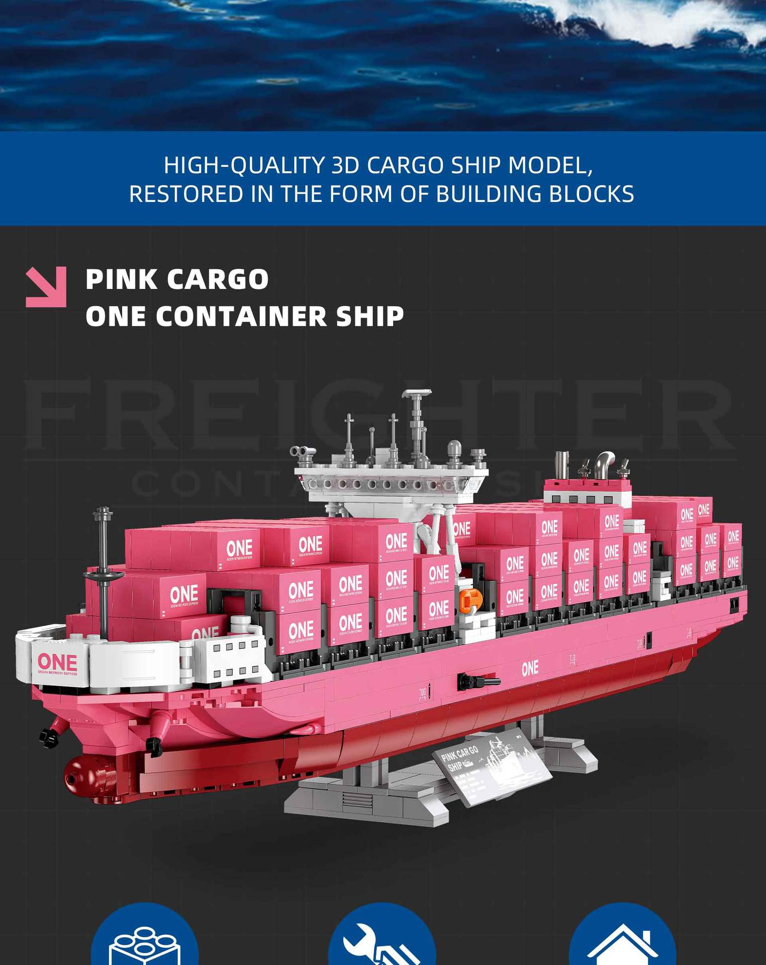 杰星JJ9127粉红色货轮one集装箱船玩具积木摆件DIY拼装跨境爆品