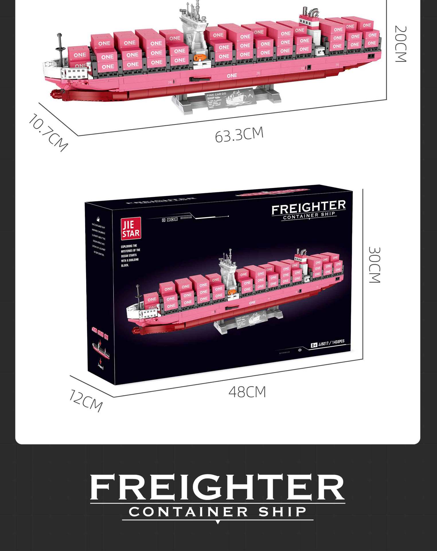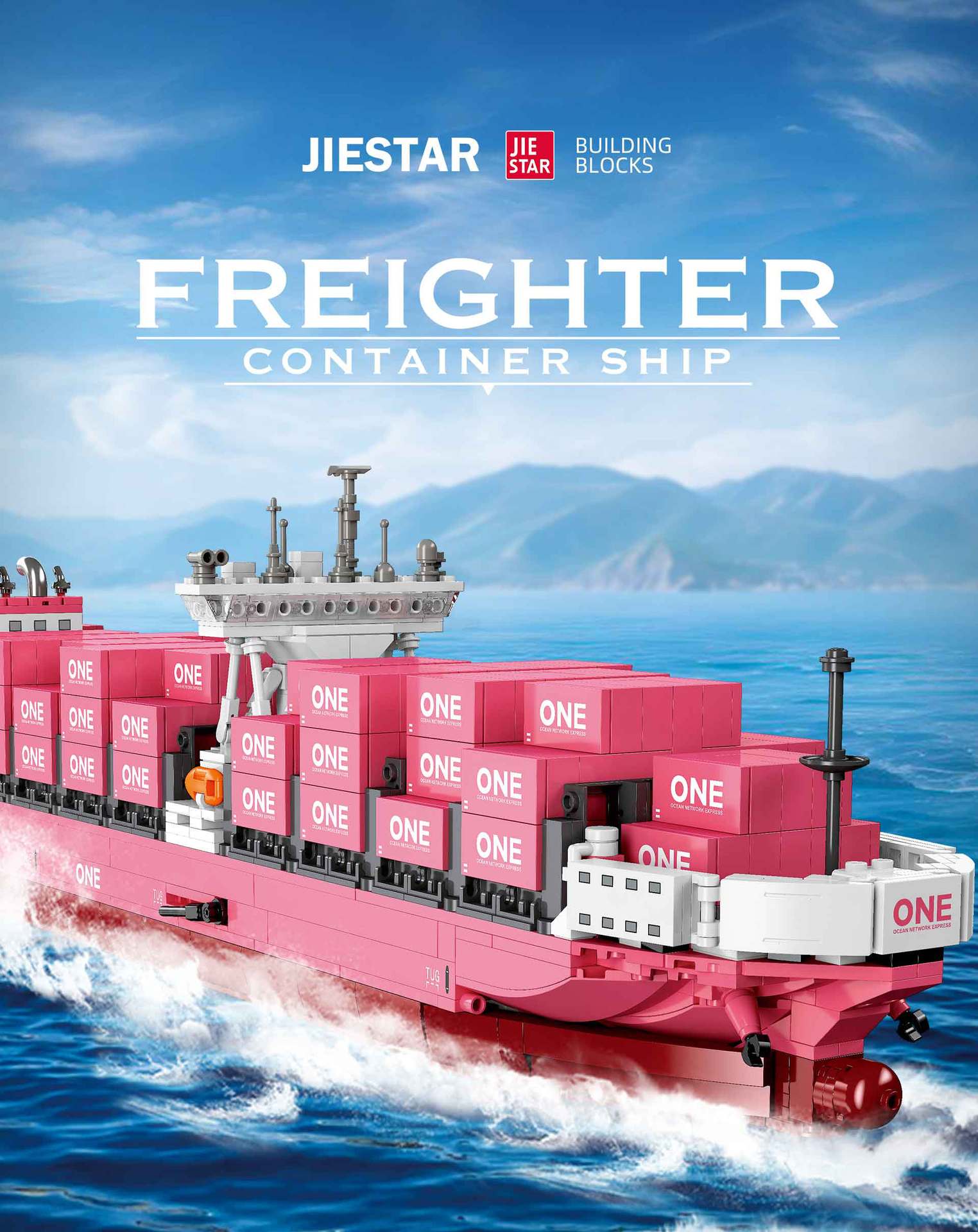 杰星JJ9217粉色货轮one集装箱船高难度儿童益智拼装积木模型玩具