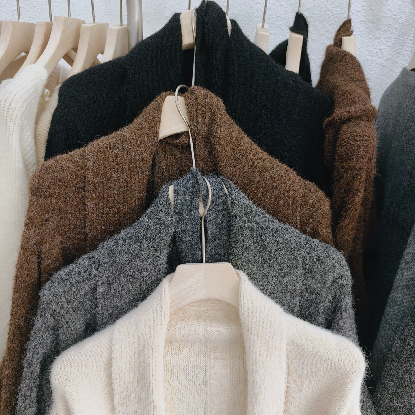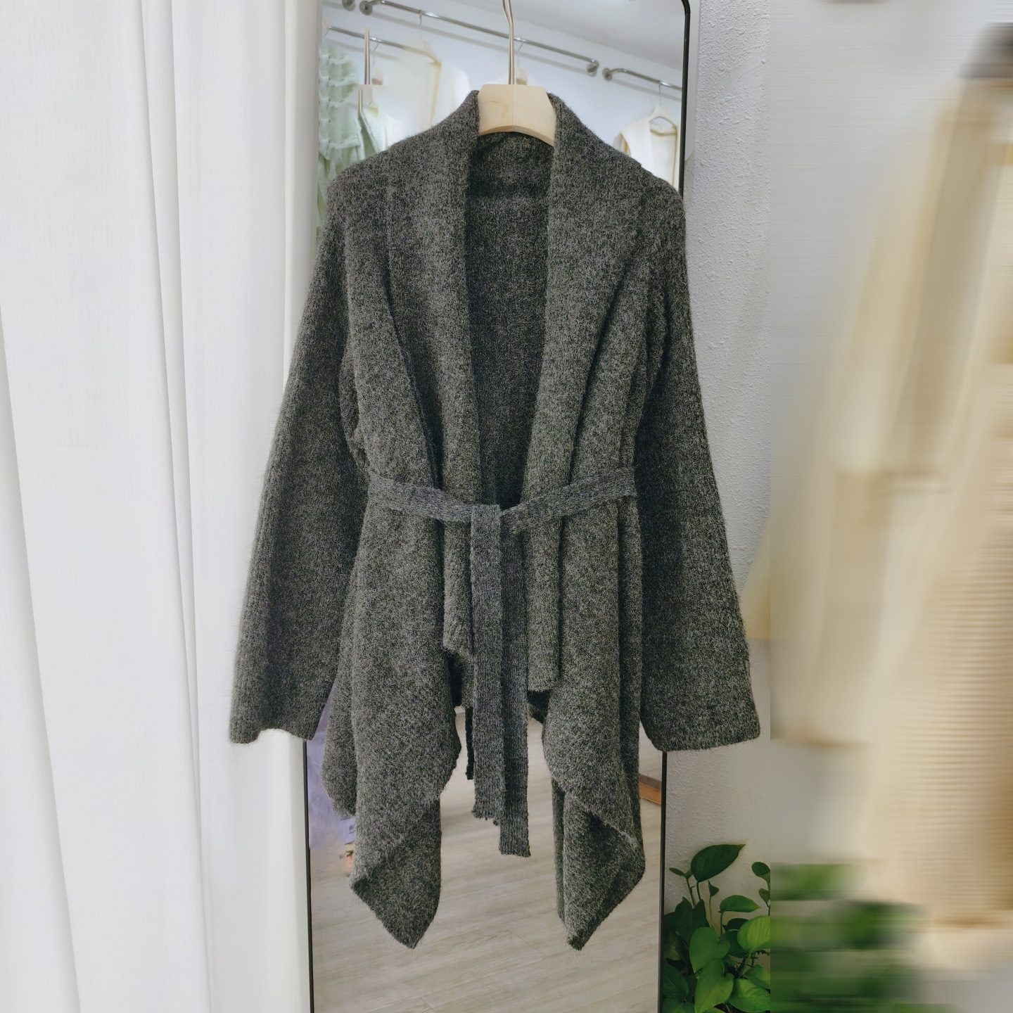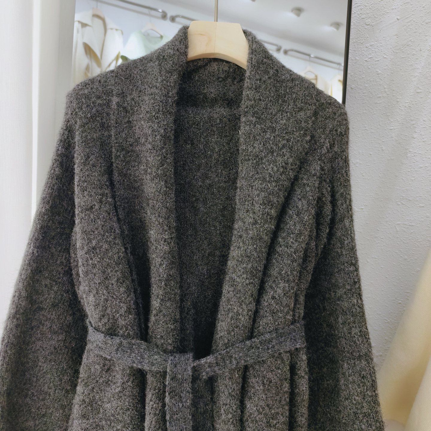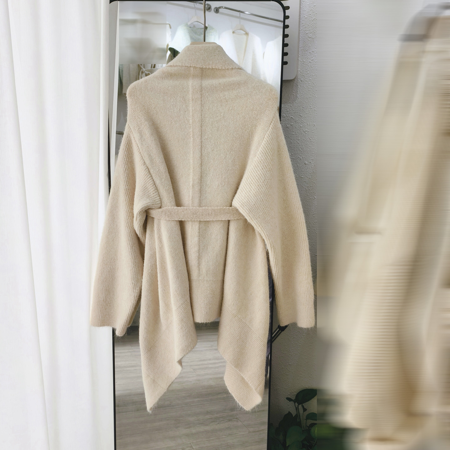 リラックスした着こなし、ゆったりとしたニットカーディガン、レディース秋冬スカーフカラー、高級アウター、ミドル丈セータージャケット、厚手