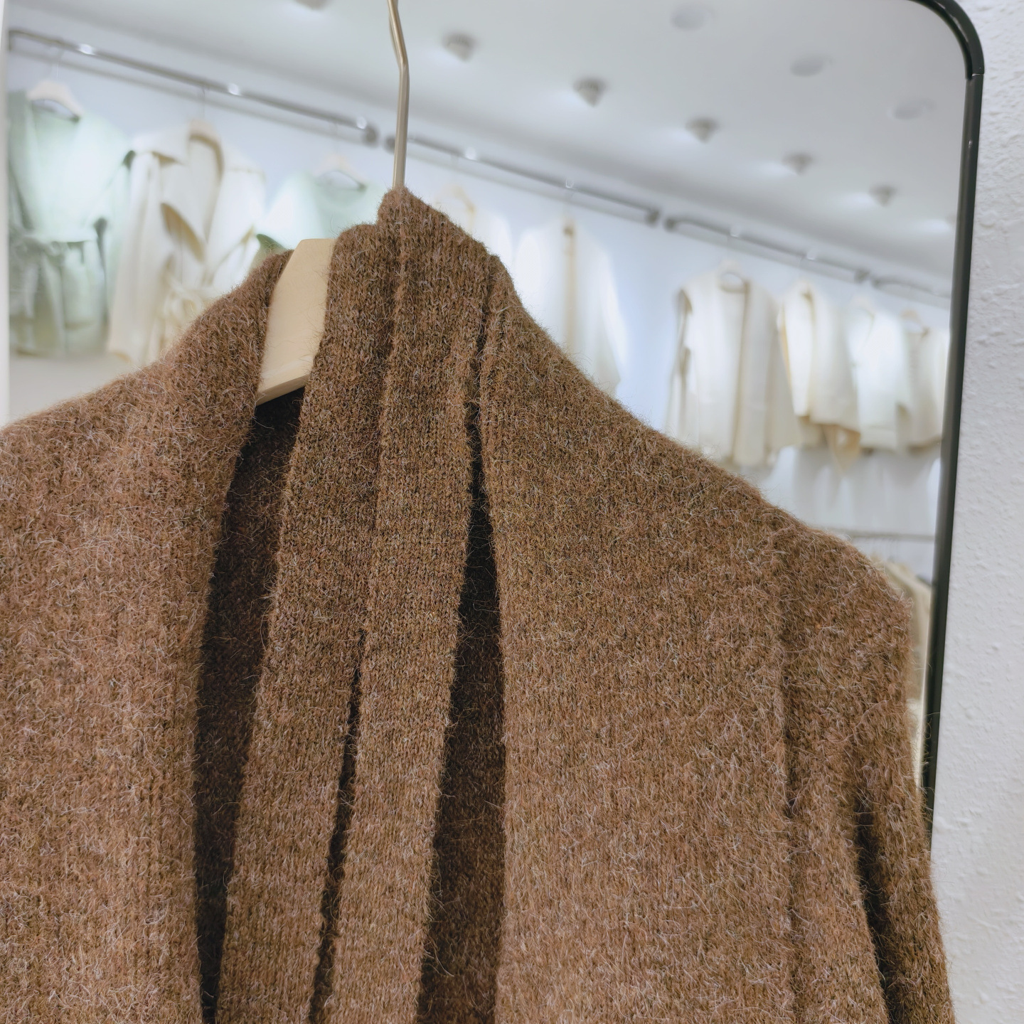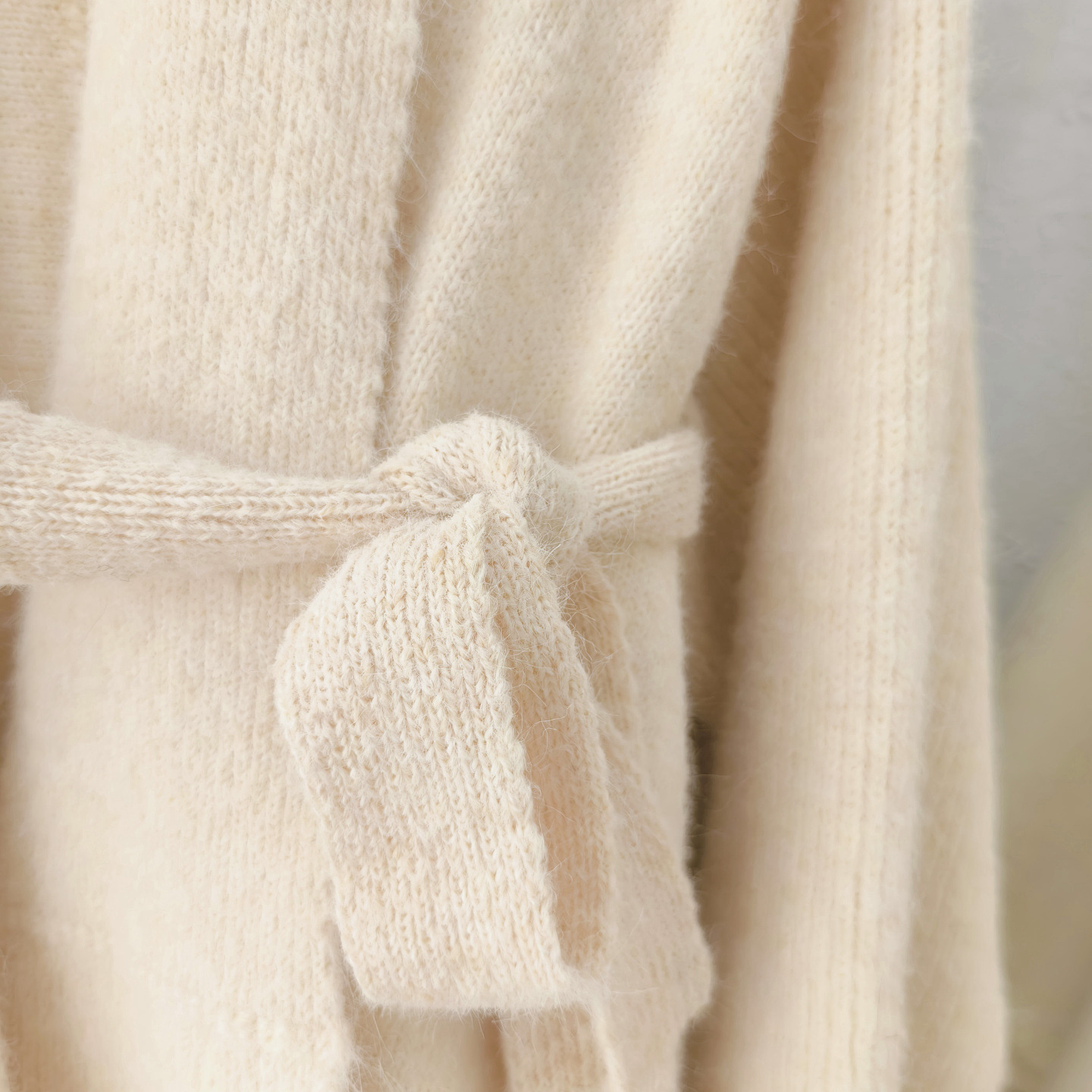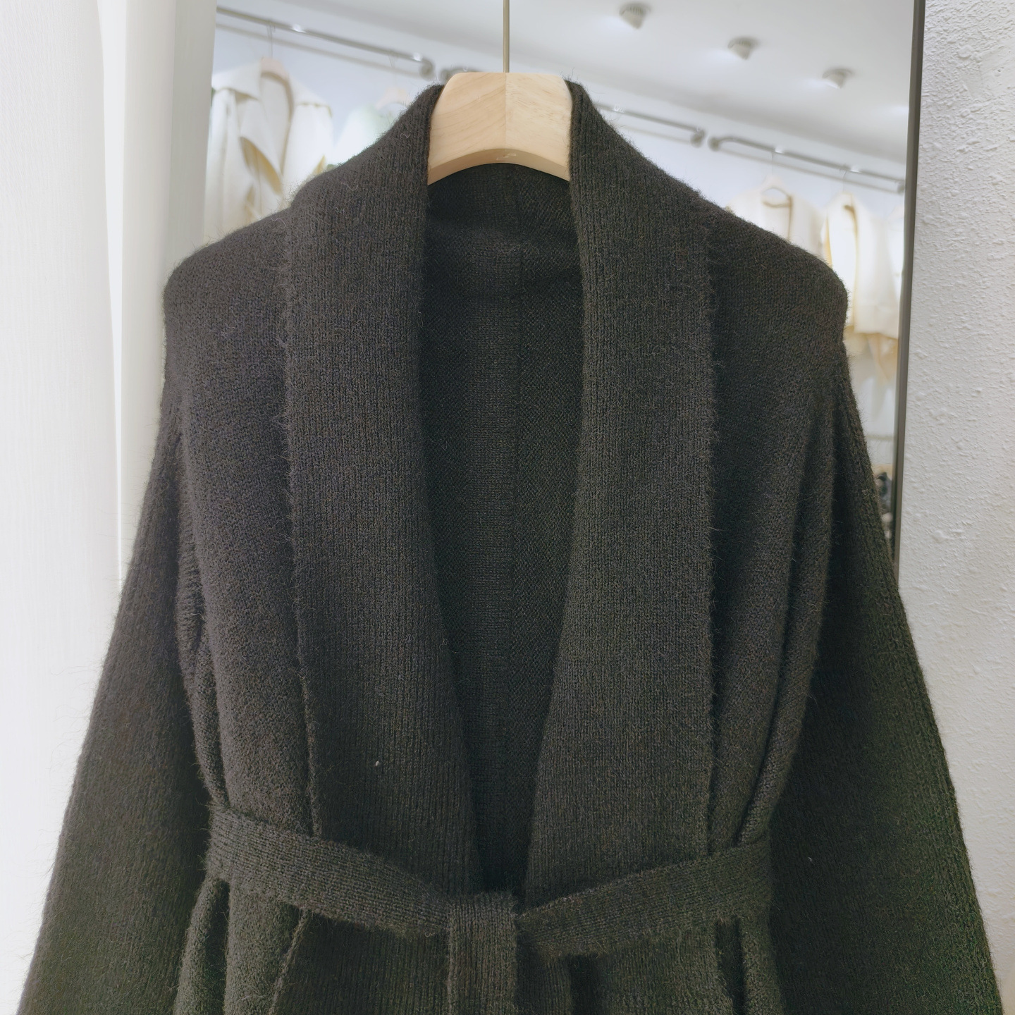 リラックスした着こなし、ゆったりとしたニットカーディガン、レディース秋冬スカーフカラー、高級アウター、ミドル丈セータージャケット、厚手