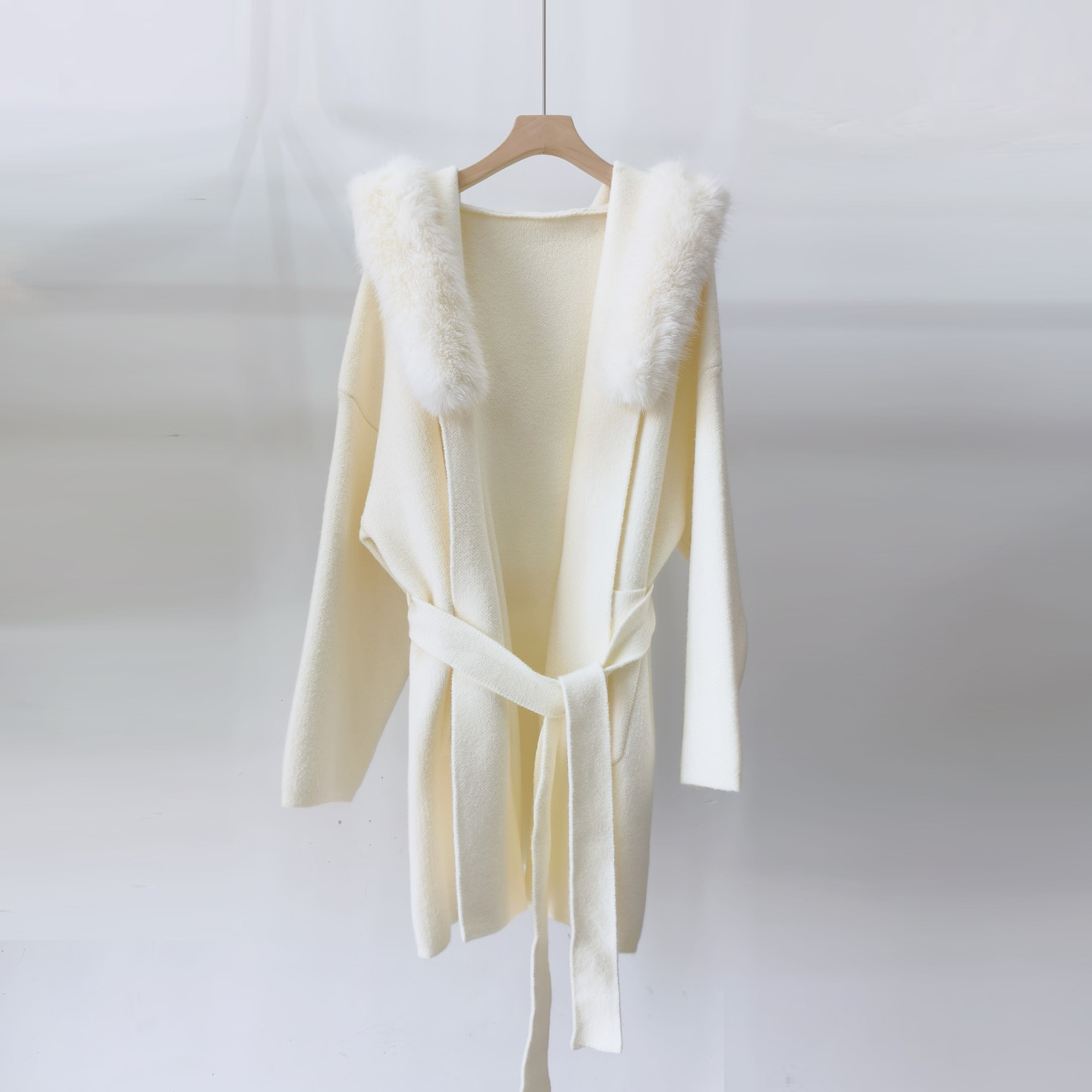 秋冬新款仿狐狸毛领连帽针织开衫毛衣外套女韩系慵懒宽松收腰外搭
