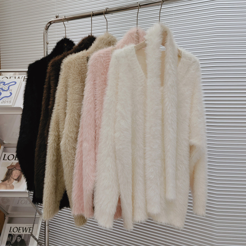 秋冬V领仿水貂绒设计感流苏毛衣女宽松慵懒风法式超厚套头针织衫