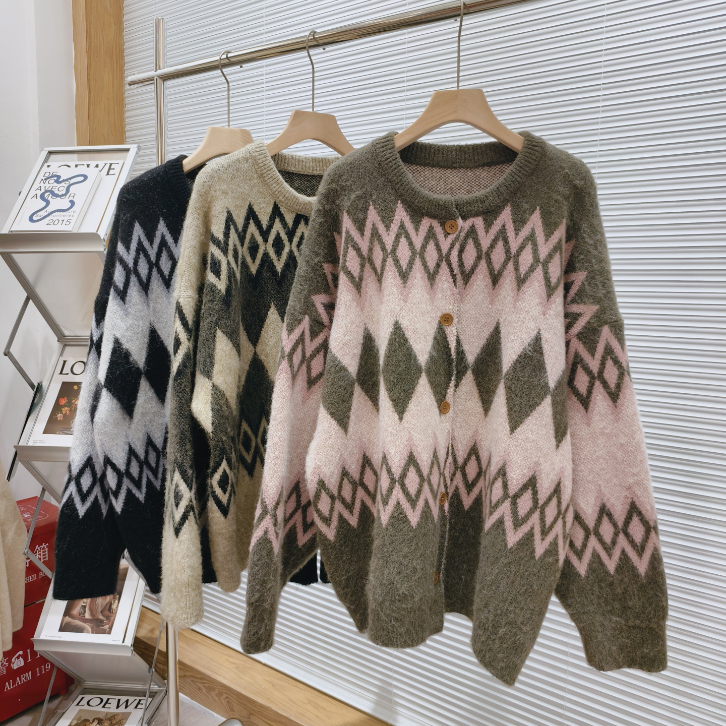 菱形チェック柄メイラードハイエンド長袖セーター女性のための秋と冬ルーズレイジースタイルソフトワックス状ビッグセータージャケット