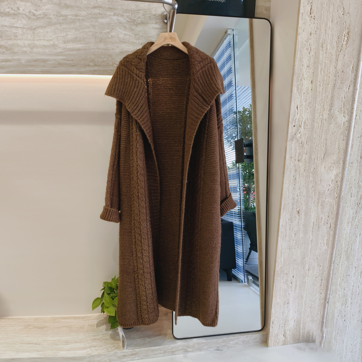 高級感の中の長さは帽子のニットのカーディガンの女性の秋冬の厚い怠惰な風の柔らかいモチモチのセーターのコートの外で掛けます。