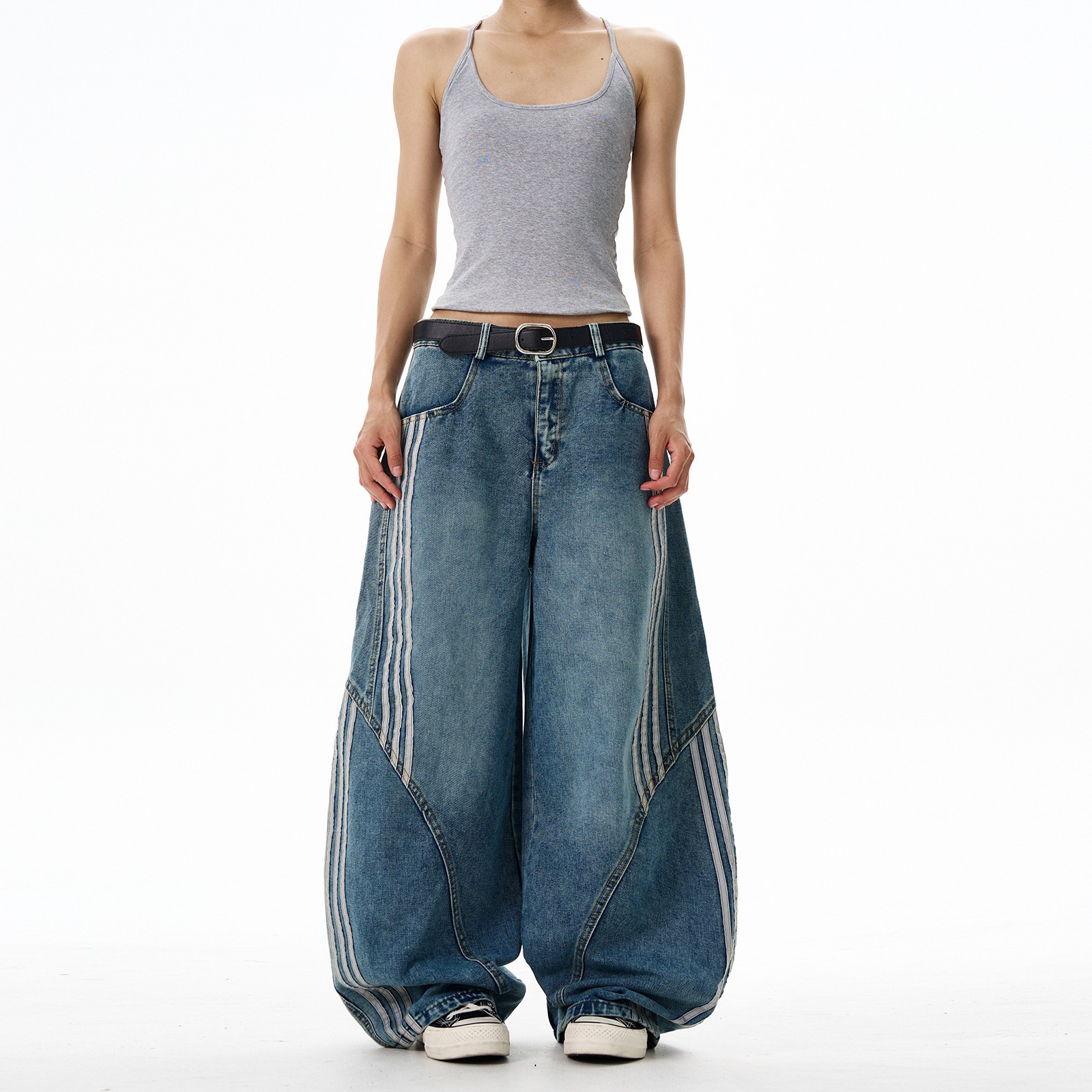 アメリカのレトロな縞模様のジーンズcleanfit広足の曲がり角のズボンの男女のゆったりしたデザイン感のカジュアルなズボンのファッション