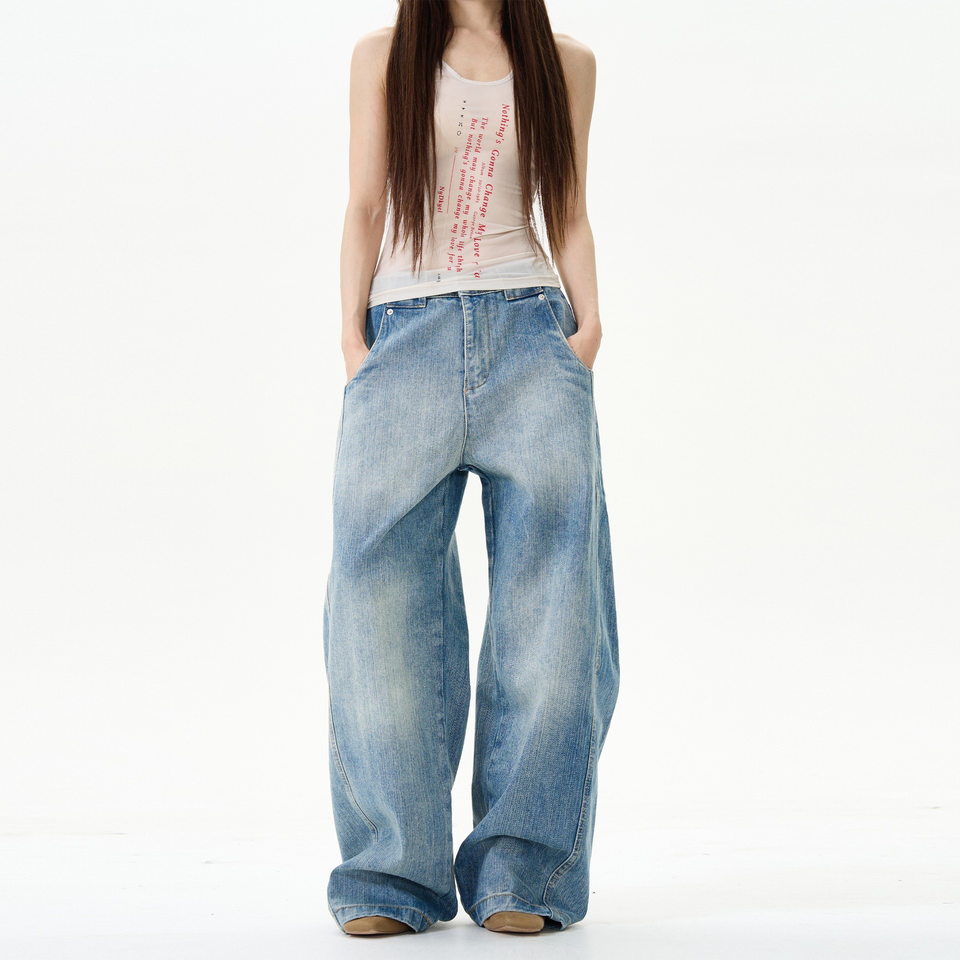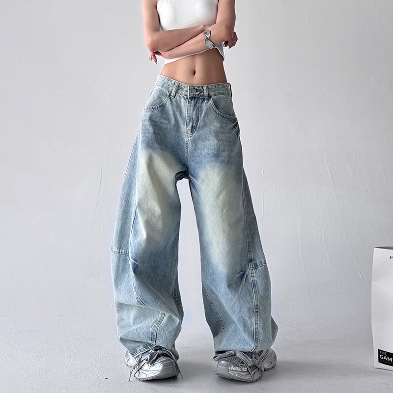 アメリカのレトロなヒップホップの街頭の水洗いの薄い青の曲がった刀のジーパンの女性の2025春の秋の新型のゆったりしている広腿のズボン