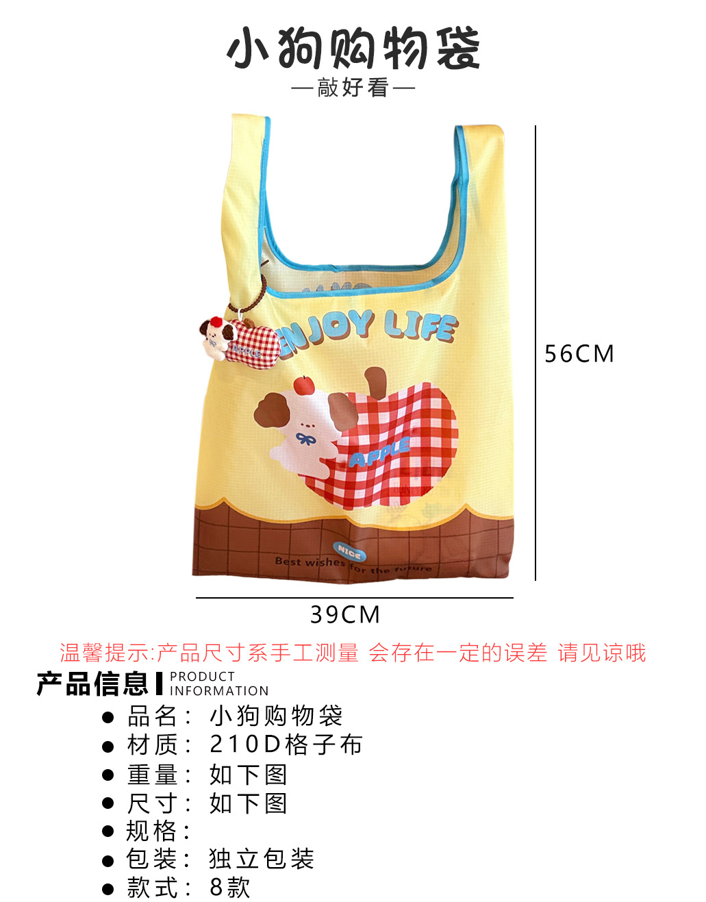 颜色 1#卡通西红柿购物袋,2#格纹苹果小狗购物袋,3#苹果小狗购物袋,4#户外小狗购物袋,5#卡通西红柿购物袋-送公仔,6#格纹苹果小狗购物袋-送公仔,7#苹果小狗购物袋-送公仔,8#户外小狗购物袋-送公仔,1#蓝黄小猫-购物袋,2#粉白小狗-购物袋,3#涂鸦插画-购物袋,4#黑色猫咪-购物袋,1#绿色-春日苹果购物袋,2#红色-苹果西高地购物袋,3#黄色-音乐小狗购物袋,4#蓝色-艺术家小狗购物袋