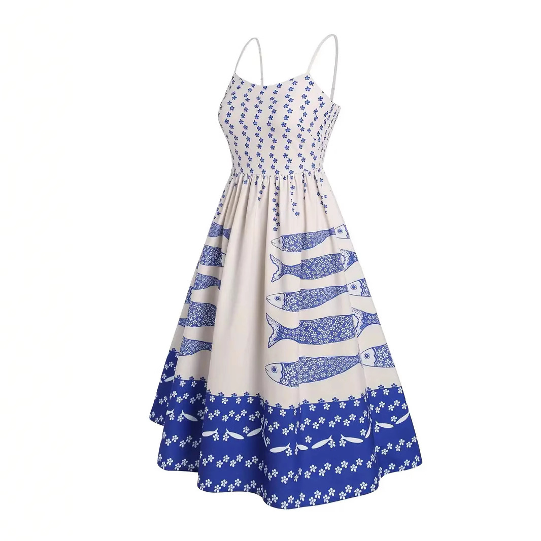 欧米のアマゾンは越境して春夏の新型のプリントストラップの背中の大きい振り子のワンピースを引っ張って腰の波を収めてリゾート風を打ちます。