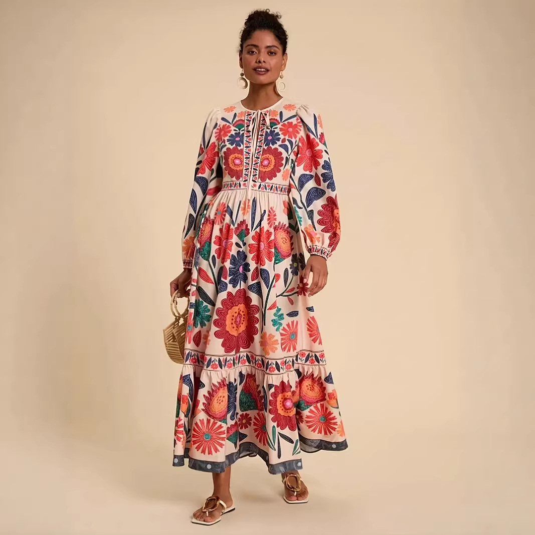スポットアマゾンクロスボーダー外国貿易ebay2025独立ステーションプリントスイングスカート長袖レースアップカジュアルドレス