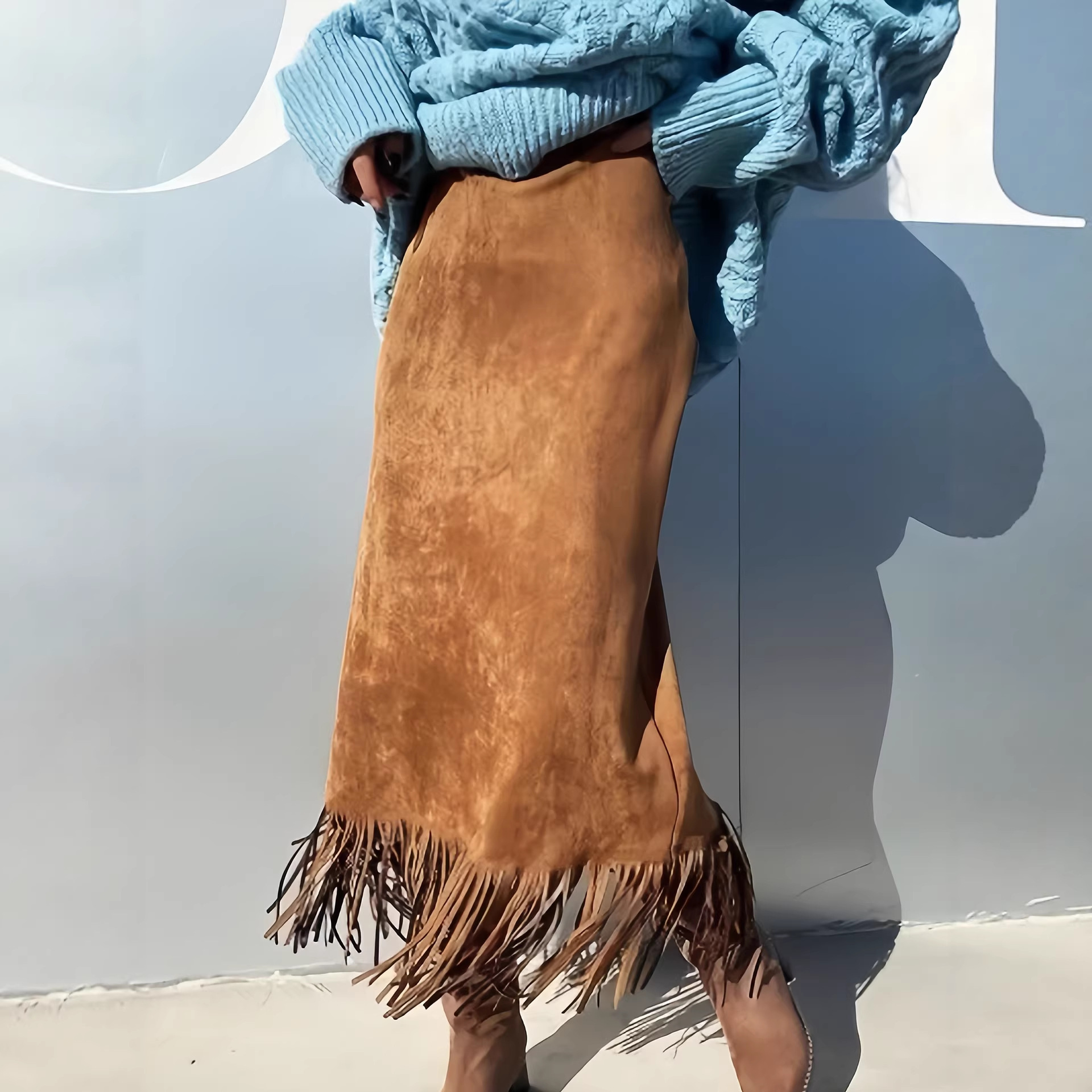 2025女士秋冬时尚优雅的流苏长款麂皮绒半身裙,舒适修身H型长裙