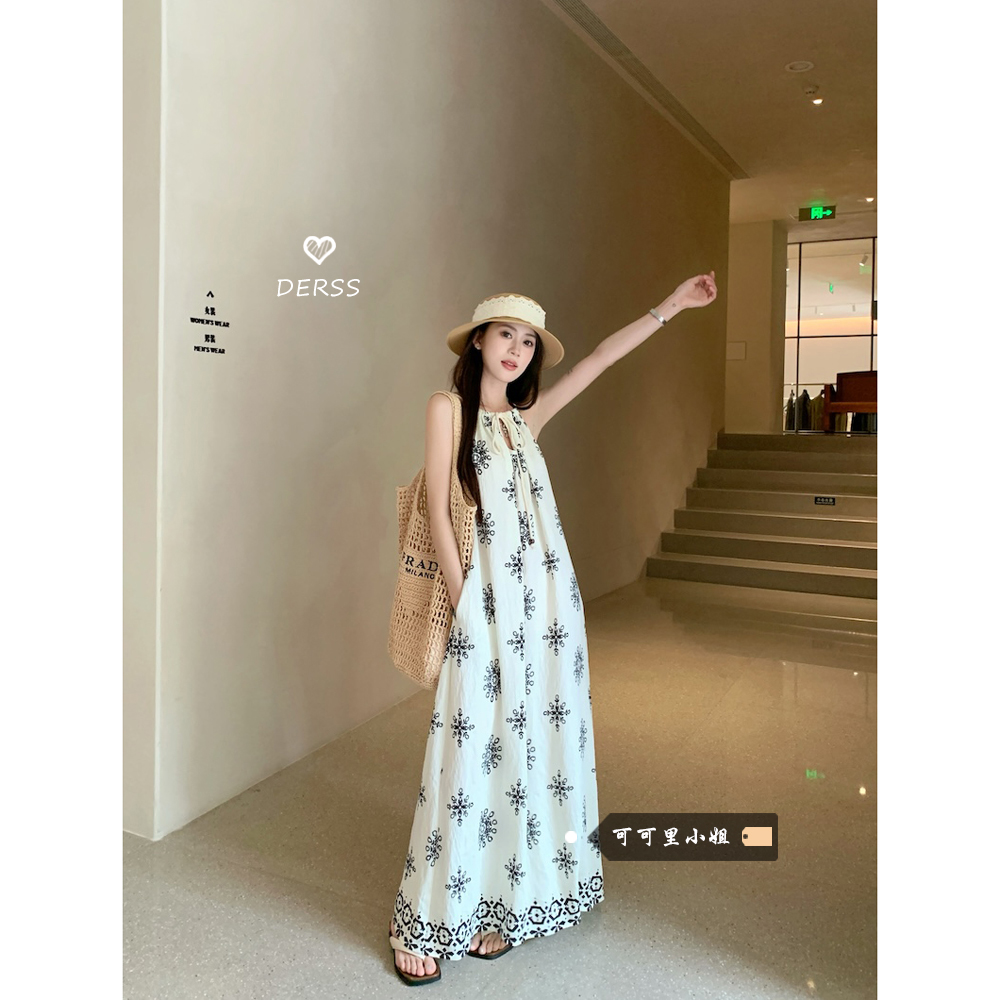 フレンチリゾートスタイルの女性用サスペンダードレス2025夏の新しいスタイルのレースアッププリントルーズロングスカート小柄な人向け