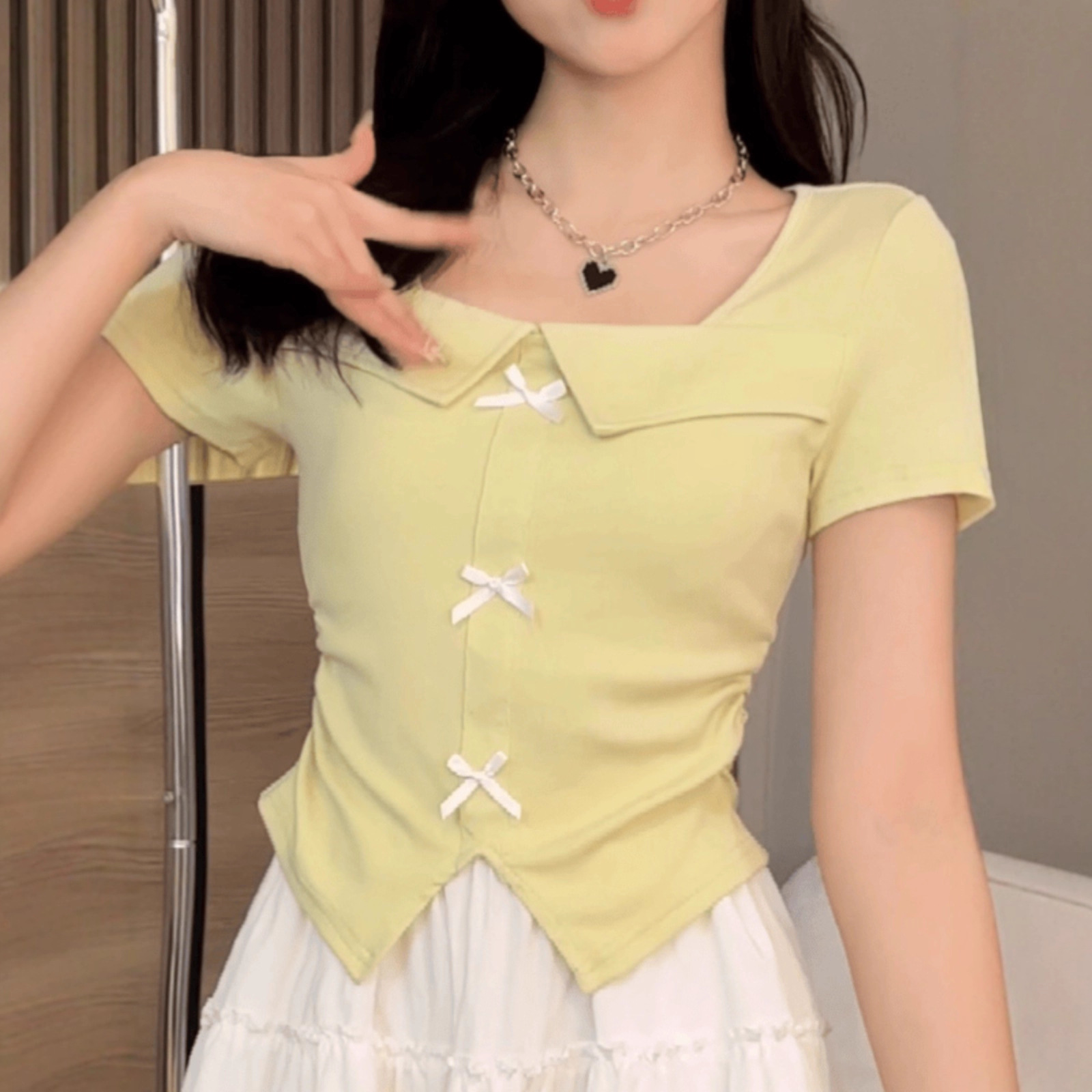 スクエアネック鎖骨右肩半袖Tシャツレディース2025夏新作立体リボンスリムフィットTシャツトップ