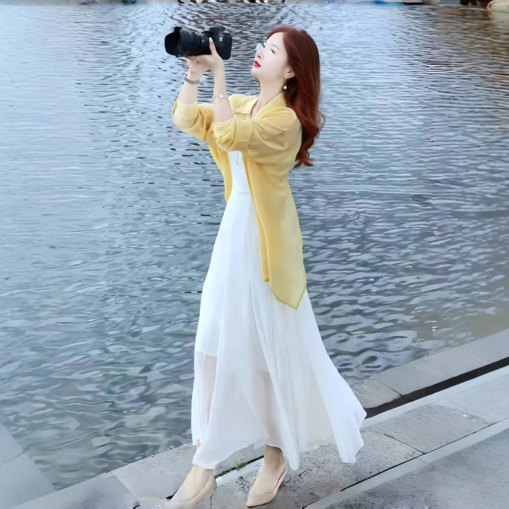 春先の海辺の休暇ドレス女性の夏の新しいアイスシルク日焼け止めシャツサスペンダースカートツーピーススーツロングスカート