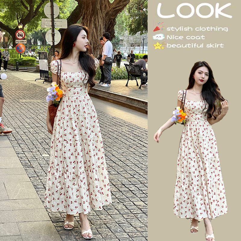 2025 新しい夏の花柄スカート女性のフレンチスタイルの白いドレス小さな新鮮なサスペンダーロングスカート夏