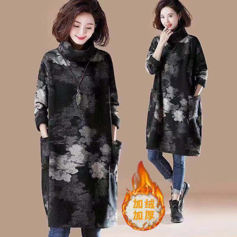 大きいサイズの婦人服にベルベットをつけて、2024秋冬の新型の中で長いサイズの太ったMMのプリントのワンピースの高襟の底のスカートの女性を厚くします。