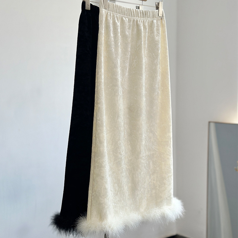 黒のベルベットとダチョウの羽根を使ったスカート、秋冬用、白の裏地付きで体型をカバーし、スリムに見せるHラインのストレートスカート、新中式