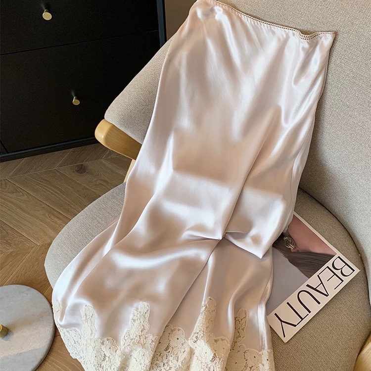 设计感醋酸缎面高腰半身裙女夏季洋气蕾丝拼接中长款鱼尾包臀裙子