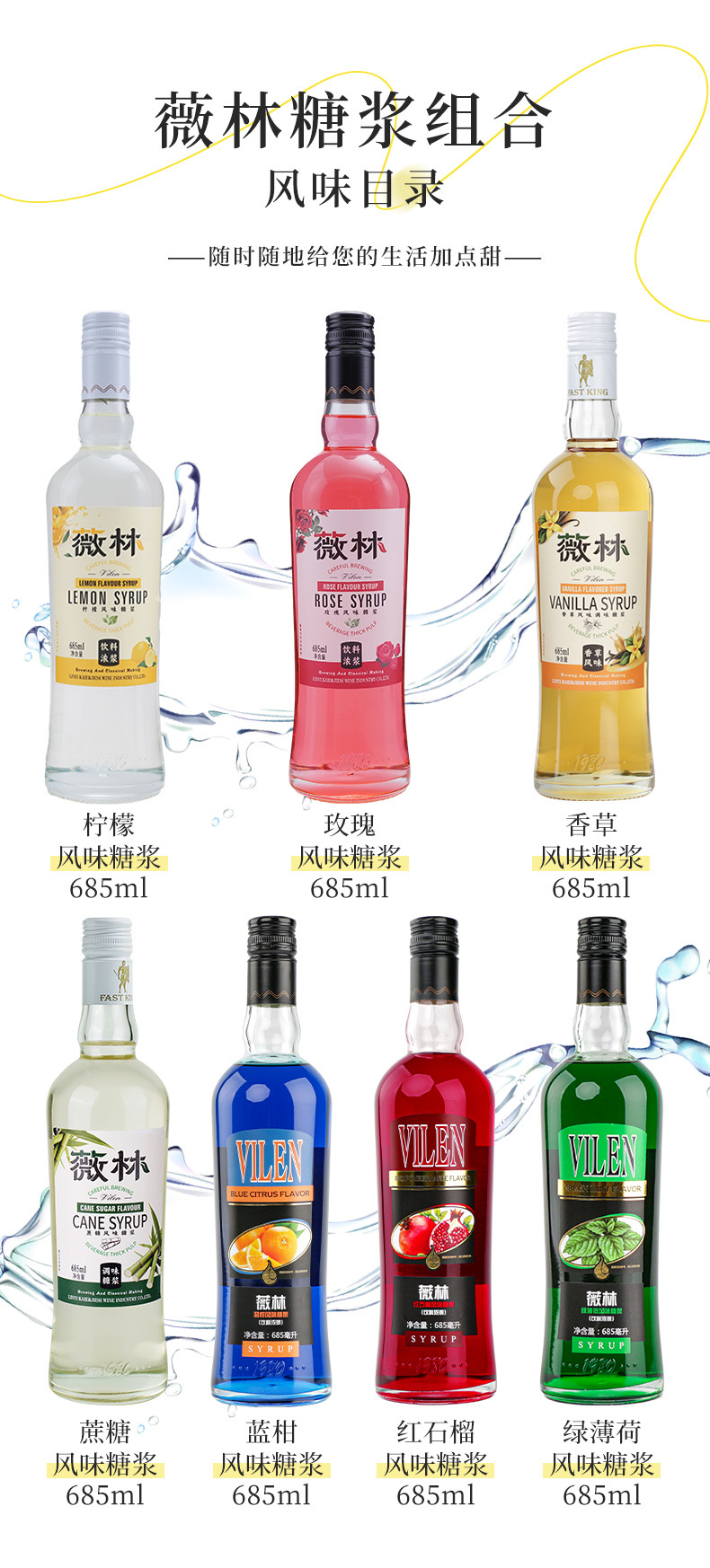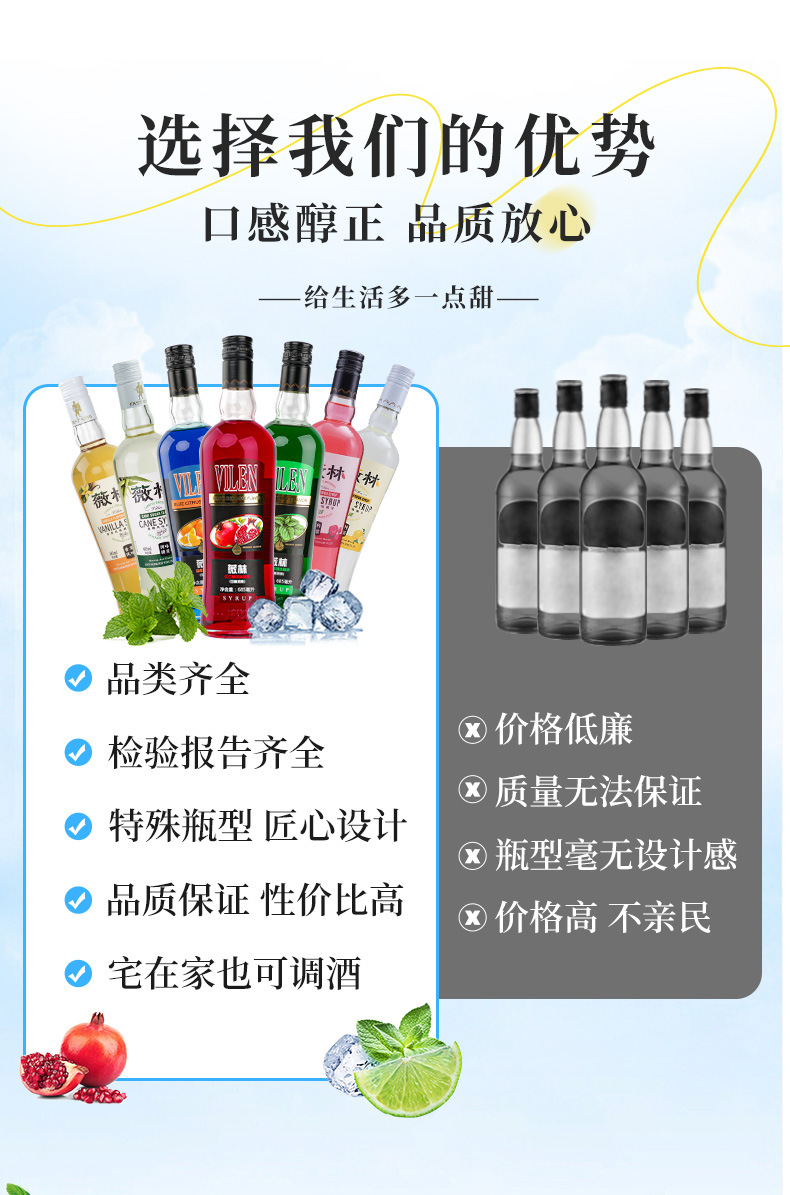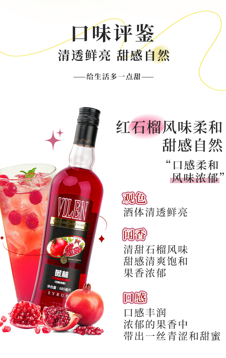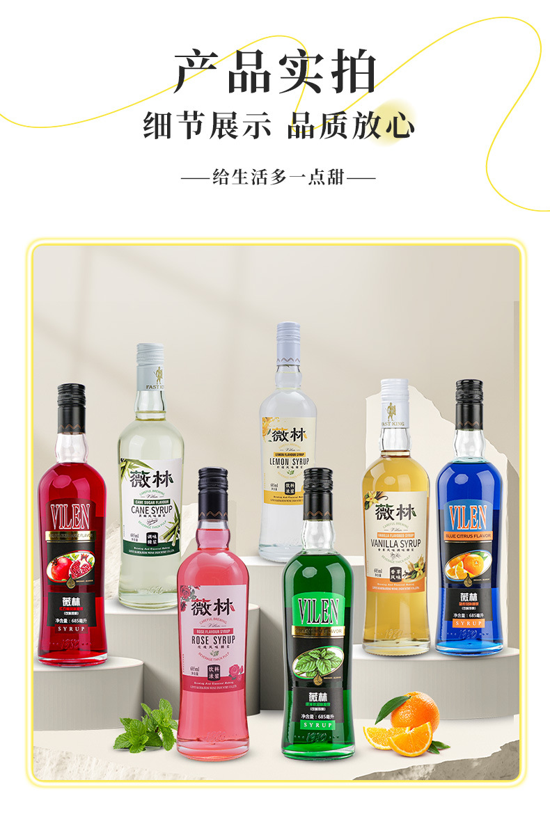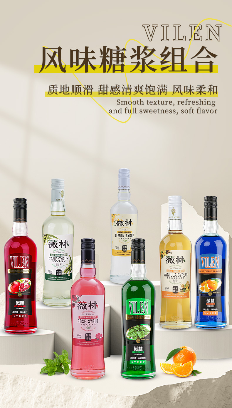 包装规格 红石榴糖浆,绿薄荷糖浆,蓝柑糖浆,莫吉托风味糖浆,蔗糖风味糖浆,柠檬风味糖浆,玫瑰风味糖浆,香草风味糖浆