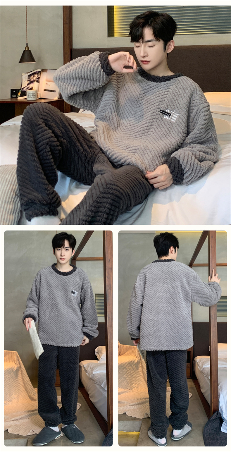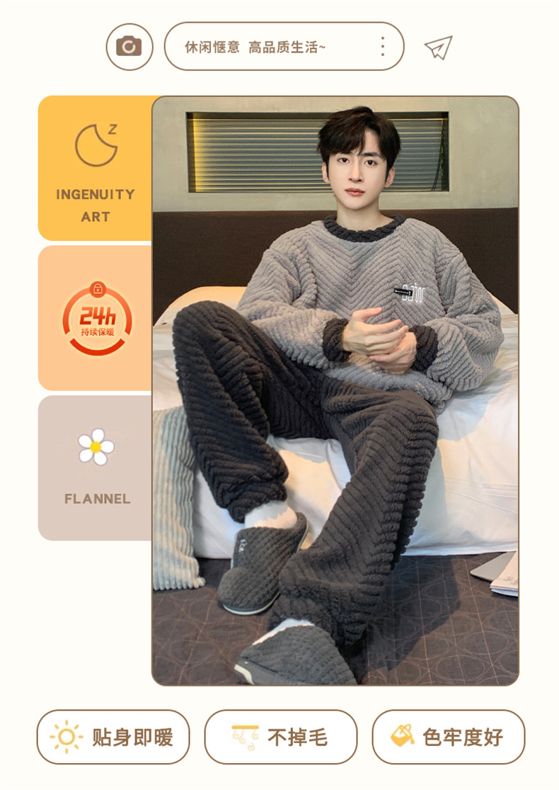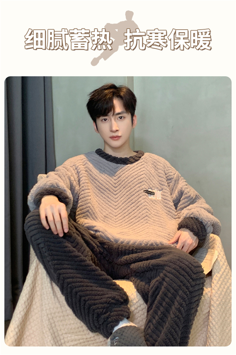 2025新款珊瑚绒睡衣男士秋冬季加绒加厚简约高档休闲家居服套装法