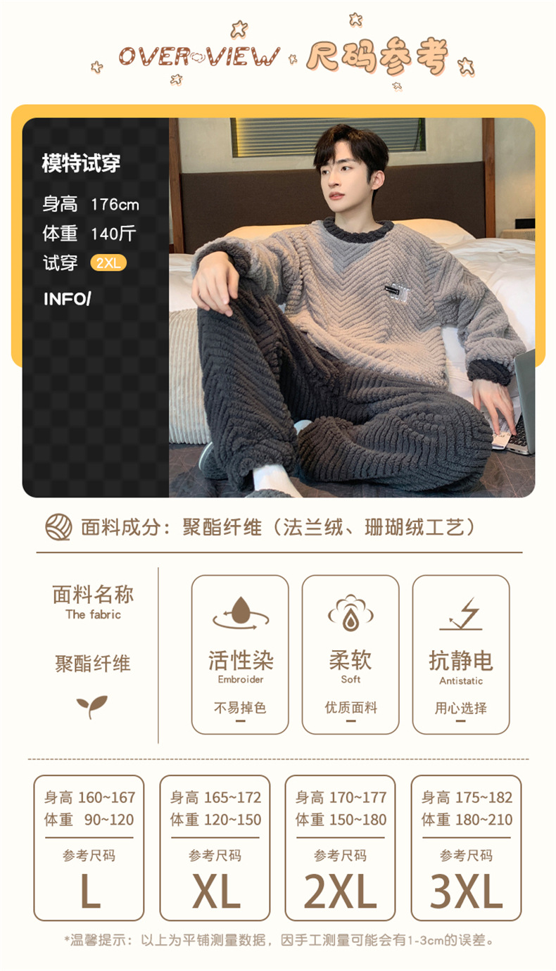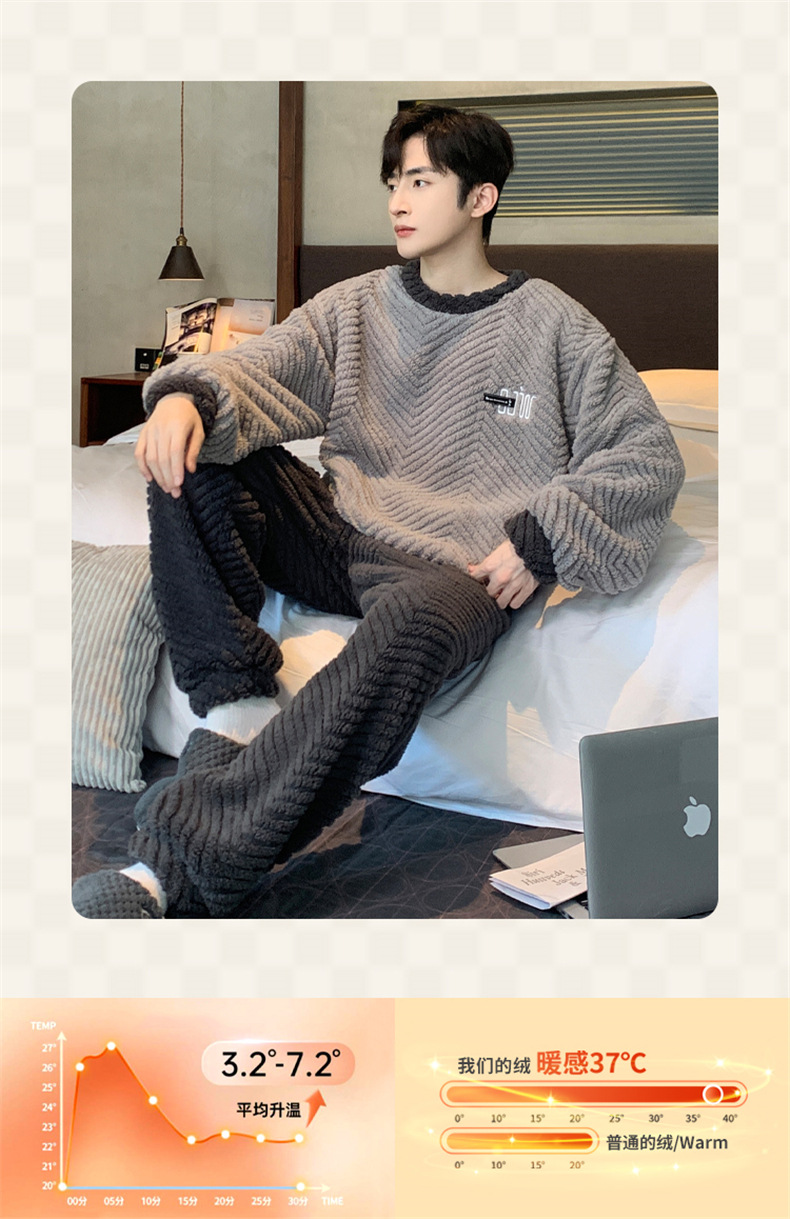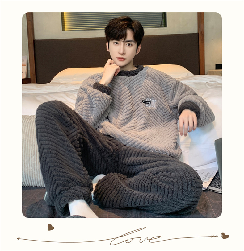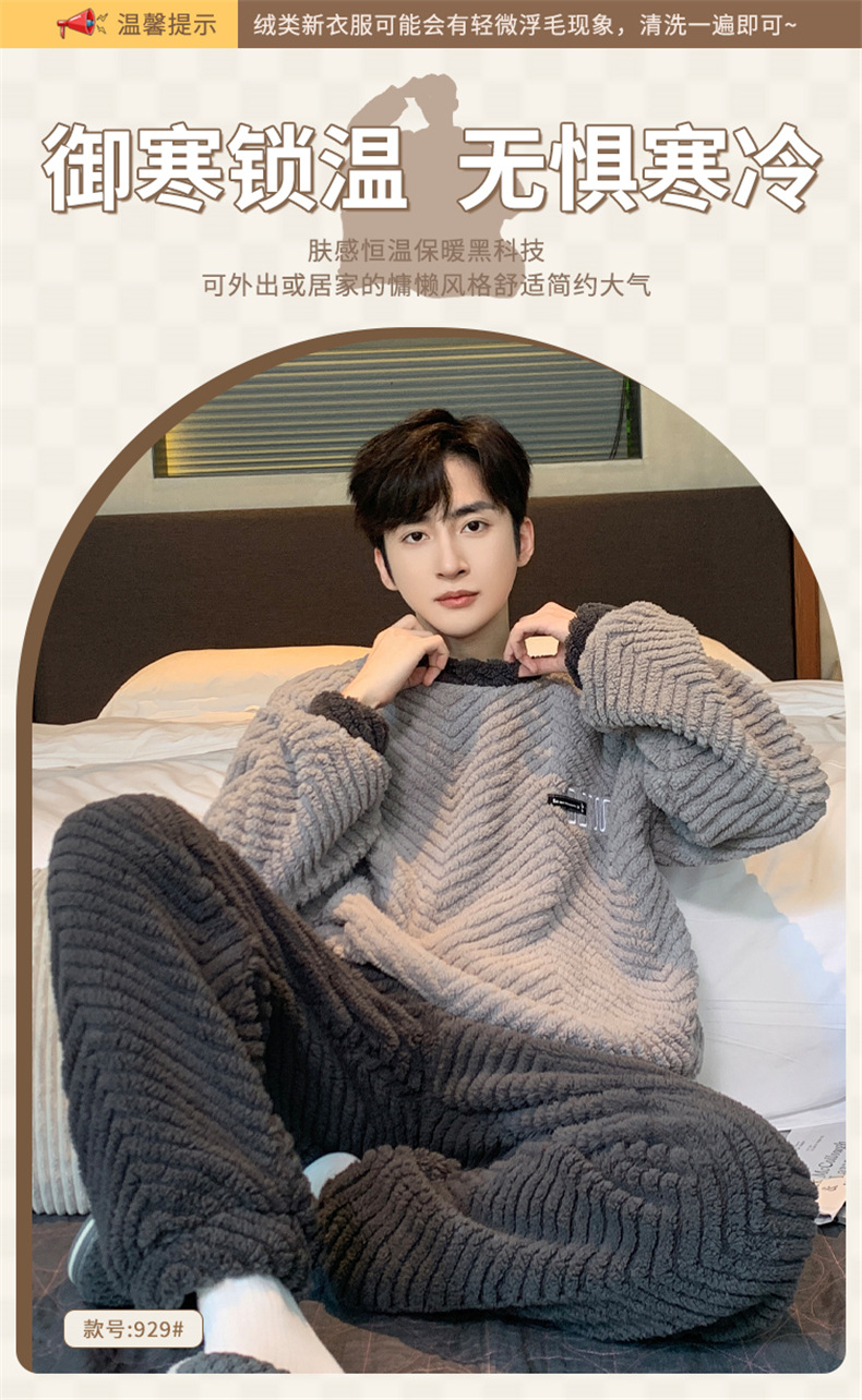 2025新款珊瑚绒睡衣男士秋冬季加绒加厚简约高档休闲家居服套装法