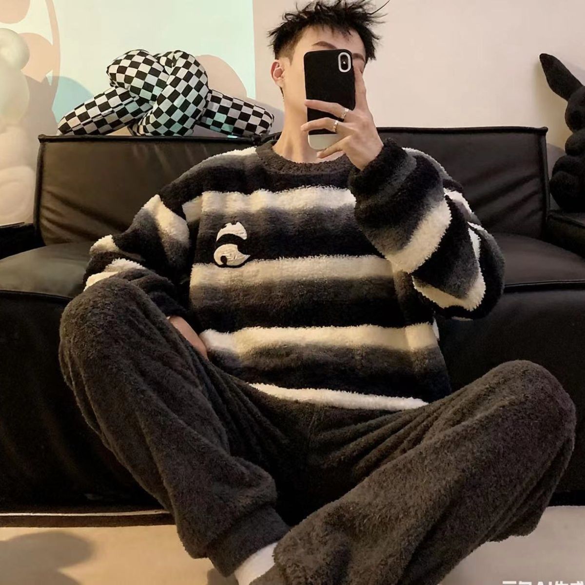 ベルベットのパジャマ男性の秋の冬にベルベットの厚い丸首セットのぬいぐるみ男性の青少年の家の服