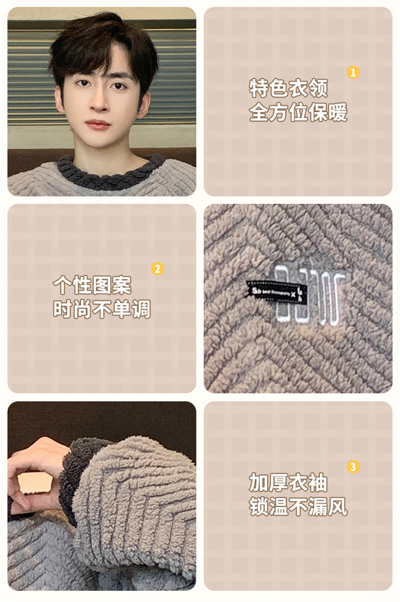 严选男士珊瑚绒套头睡衣秋冬季加厚加绒长袖法兰绒帅气家居服套装