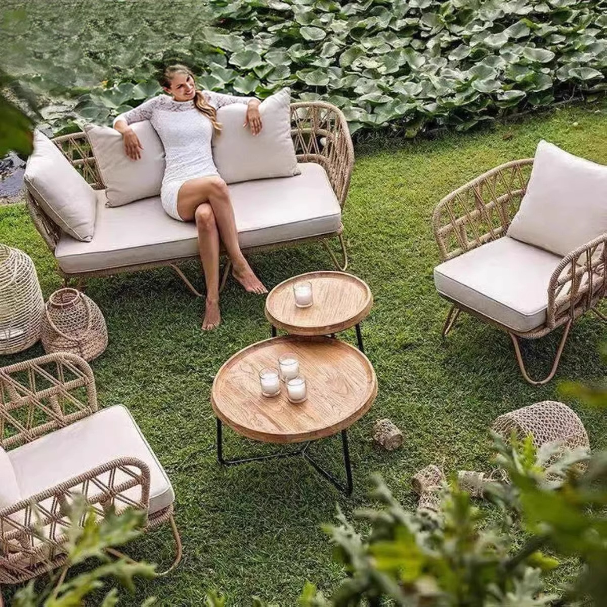 屋外籐編みソファ別荘庭防水籐椅子三点セット民宿ベランダ見本部屋レジャーソファセット