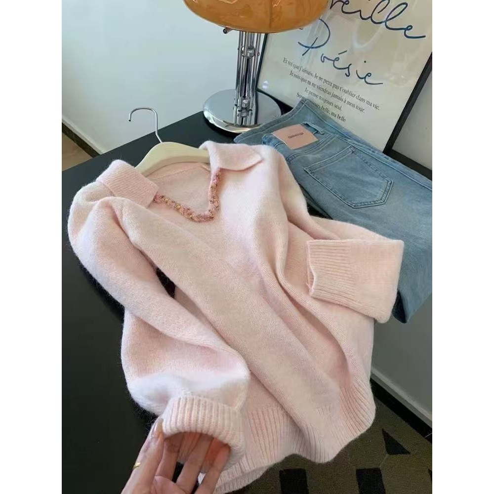 少女感粉色Polo领长袖针织毛衣女2025冬季甜美减龄洋气上衣