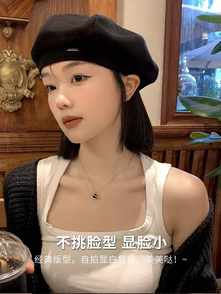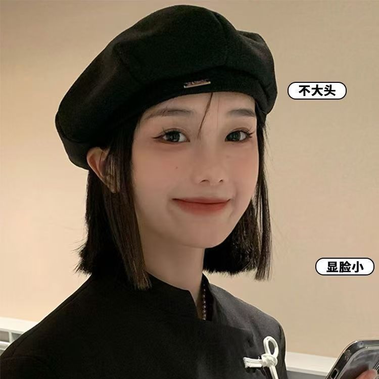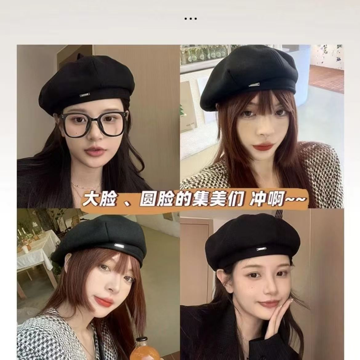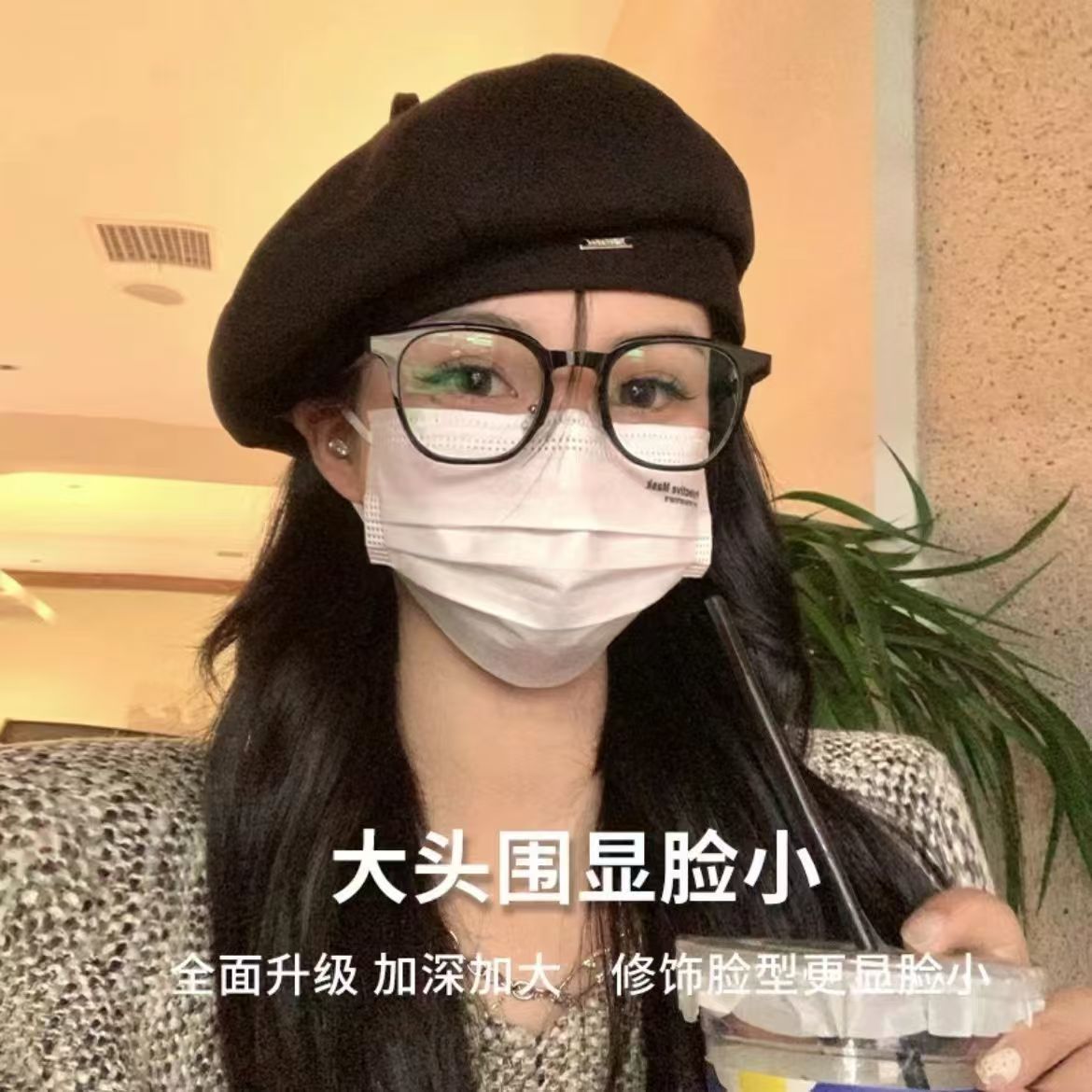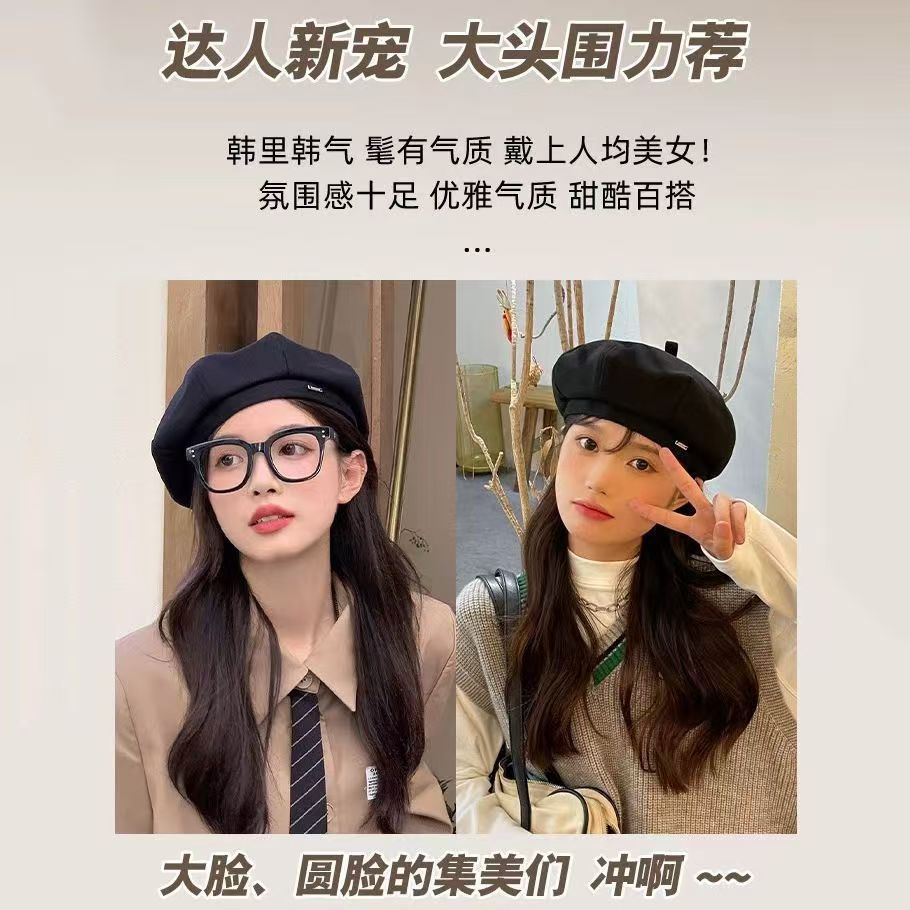 跨境贝雷帽女春秋韩系网红日系黑色八角帽大头围圆脸复古画家帽子
