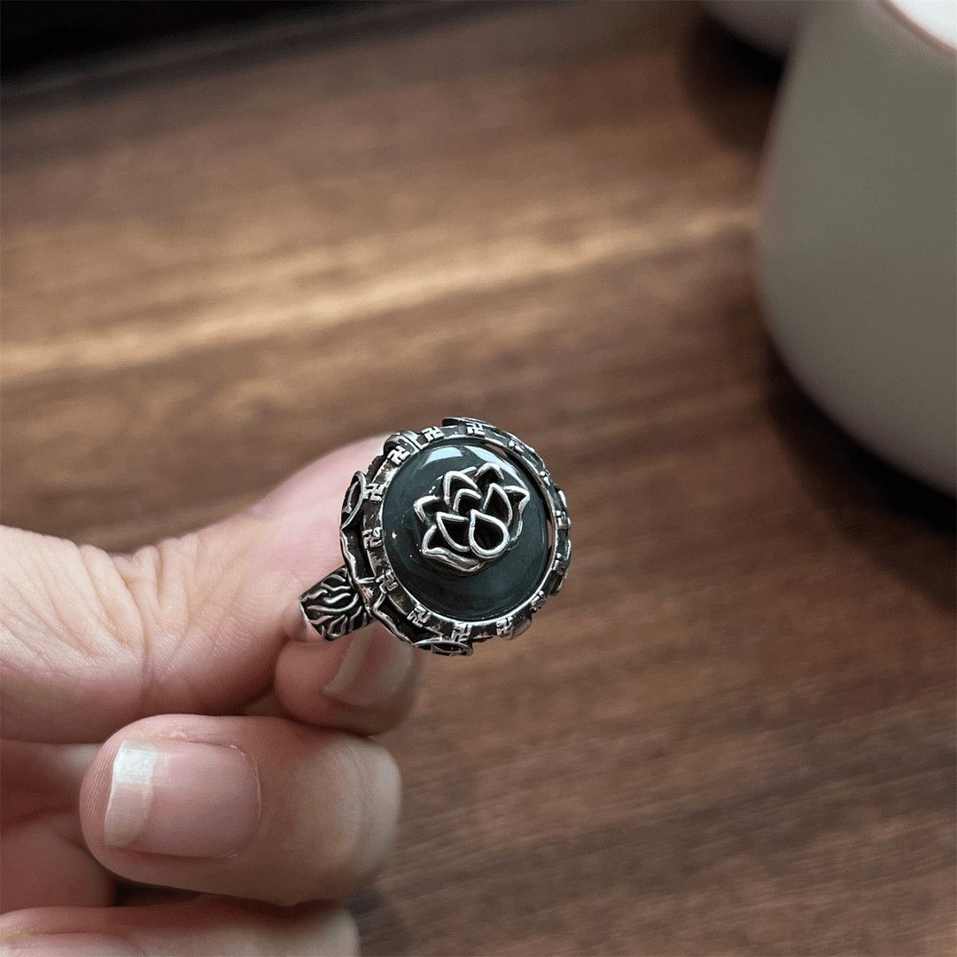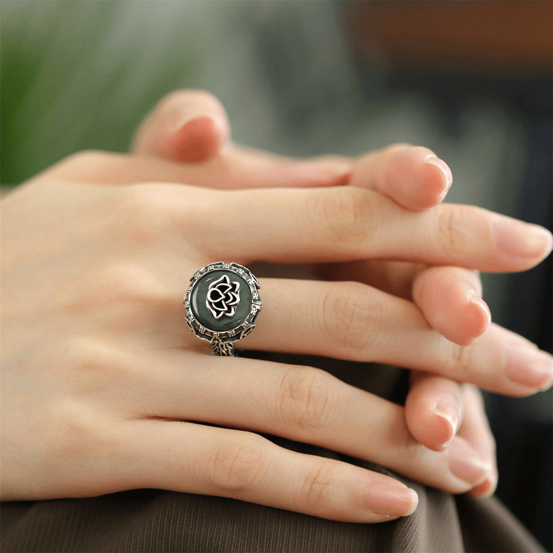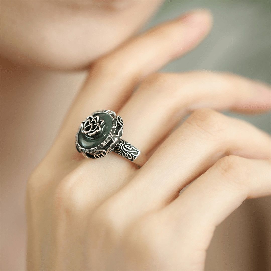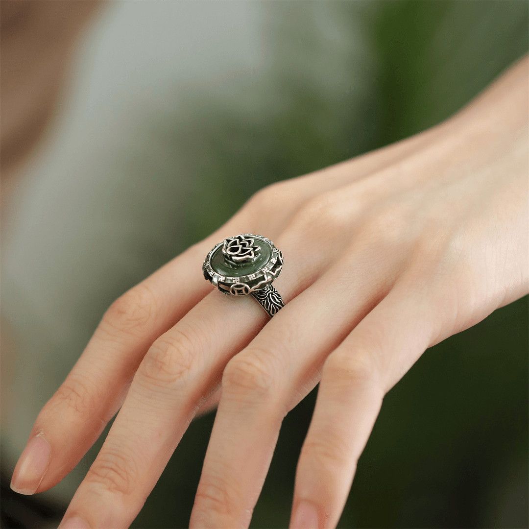 925 シルバーレトロ新中国風蓮花と翡翠の安全バックルリングリング開口部調整ニッチで多用途