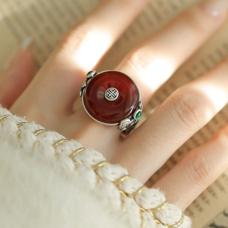 925银复古新中式红玛瑙福字平安扣浪花戒指环开口调节小众感