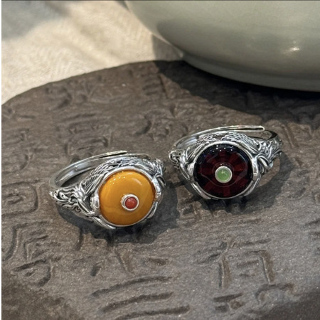 纯银S925纯银血珀蜜蜡南红复古平安扣凤凰国潮中式文艺银戒指