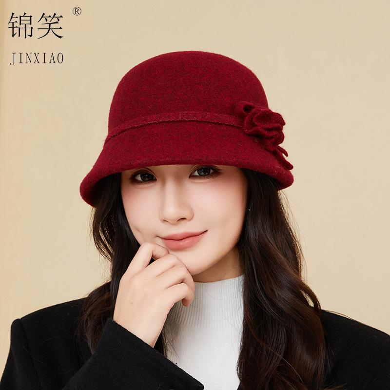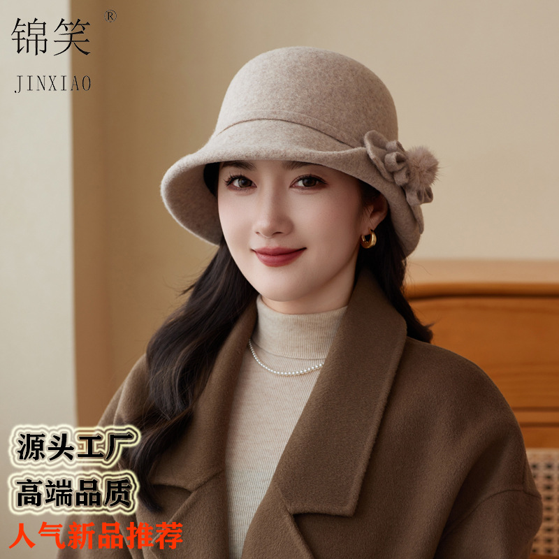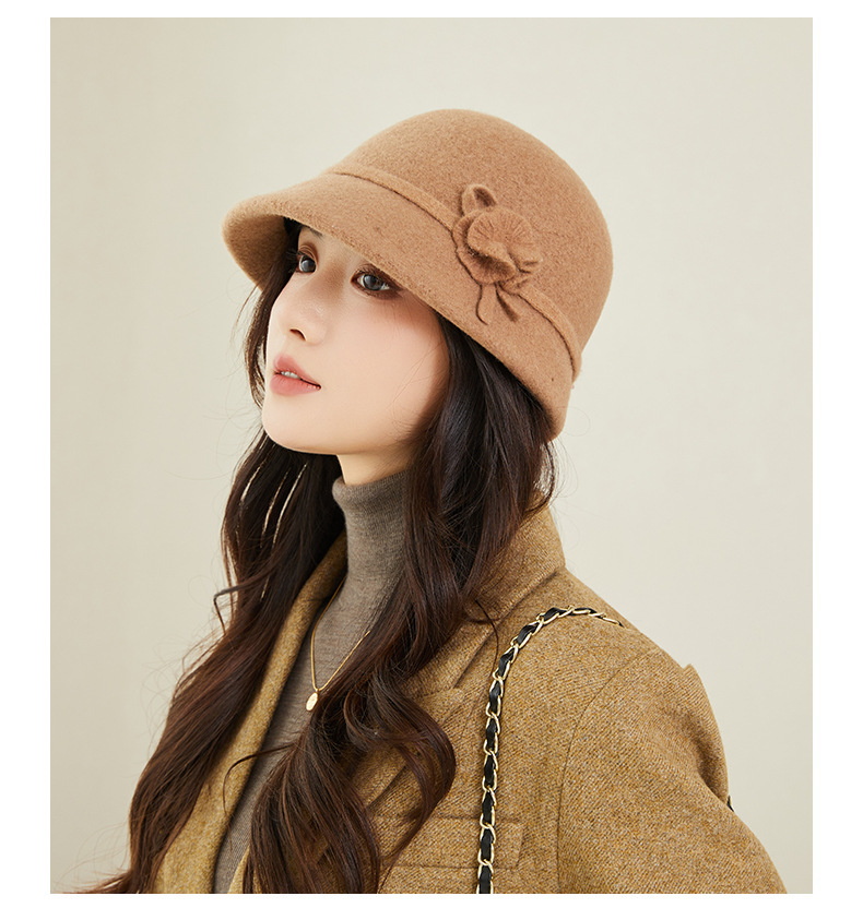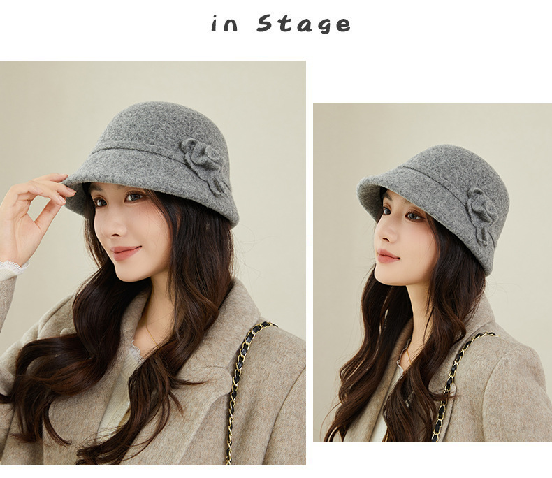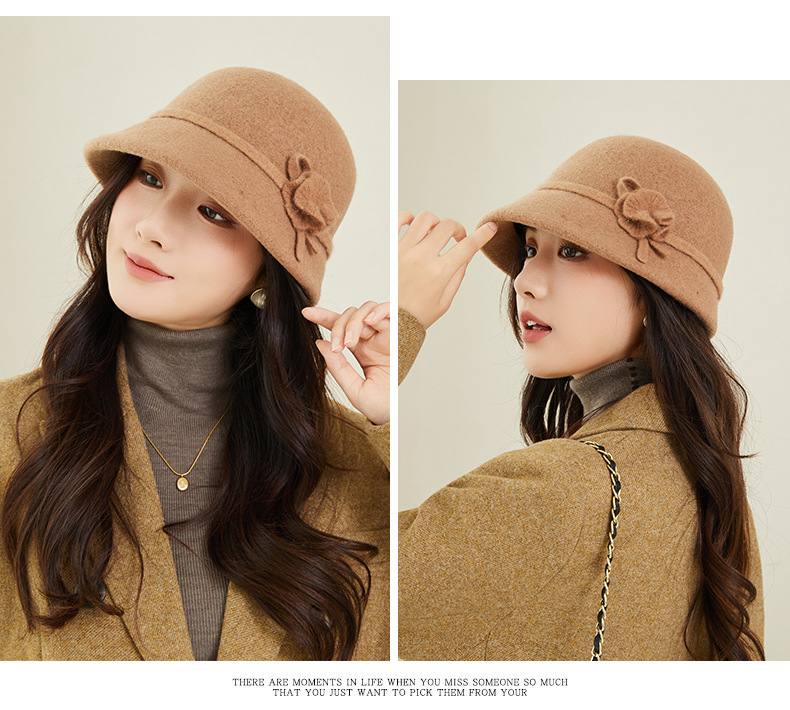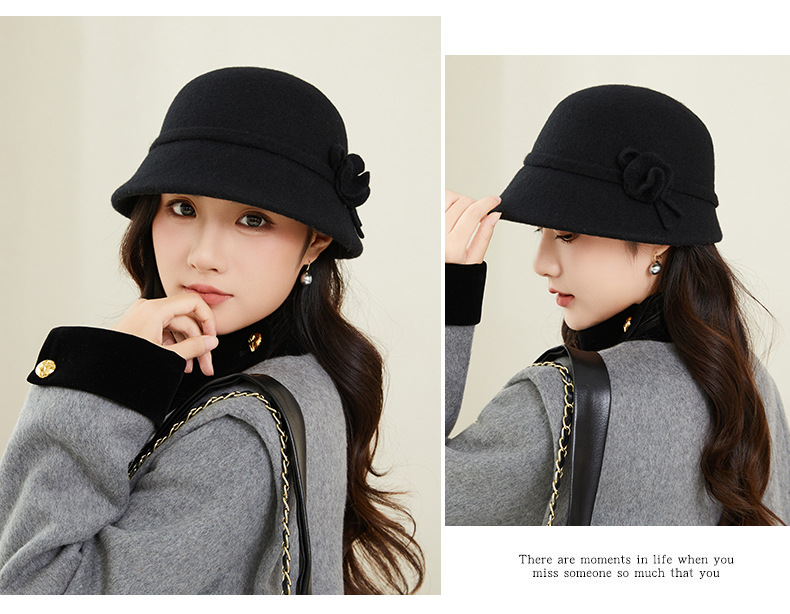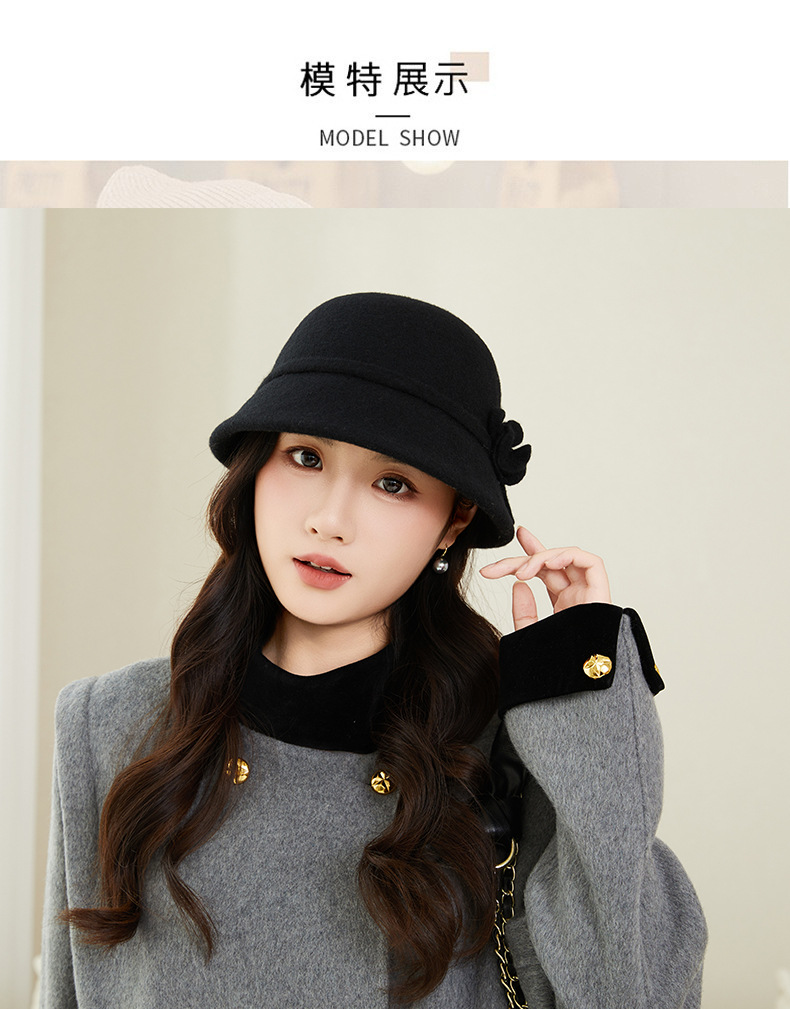 新款羊毛呢渔夫帽女秋冬保暖优雅气质盆帽高级感时尚百搭花朵礼帽