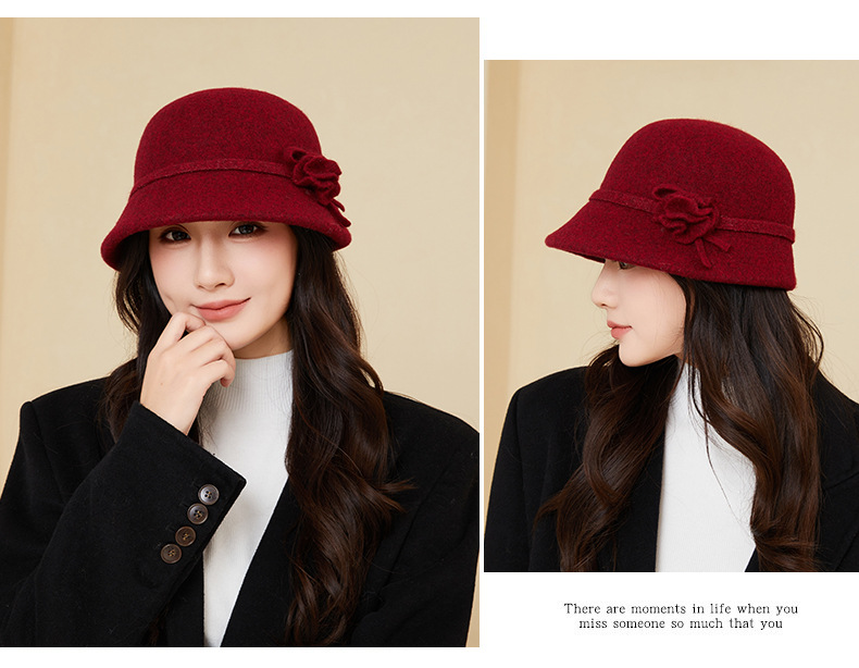 秋冬季保暖羊毛盆帽复古赫本风花朵气质渔夫帽女士优雅毛呢帽子潮