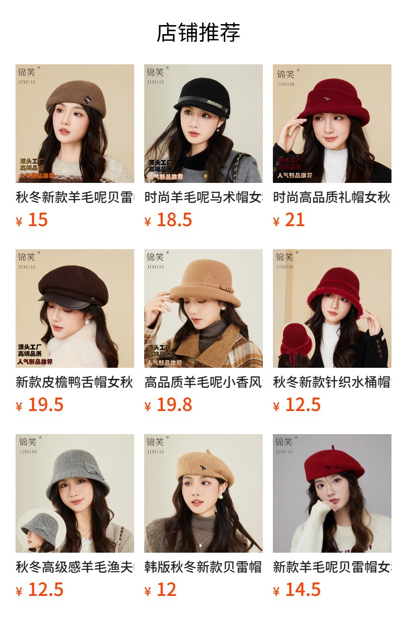 新款羊毛呢帽子女秋冬韩版时尚百搭盆帽户外出行显脸小保暖妈妈帽