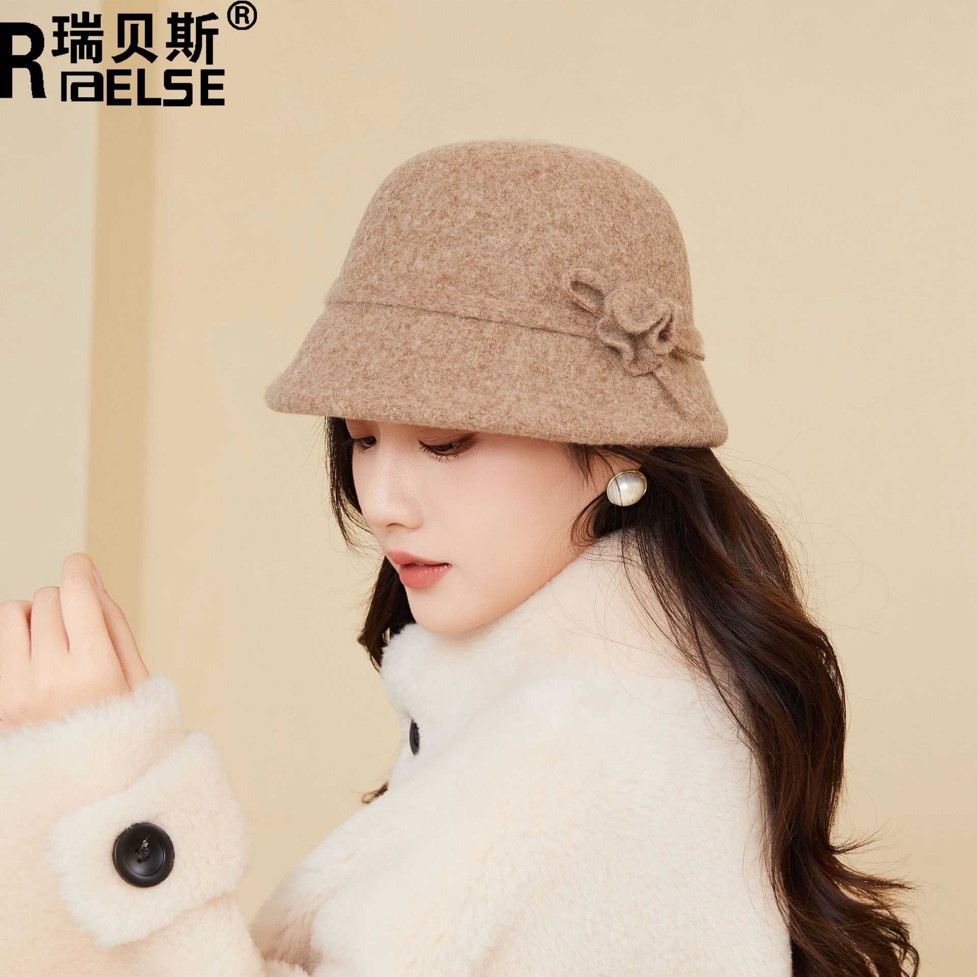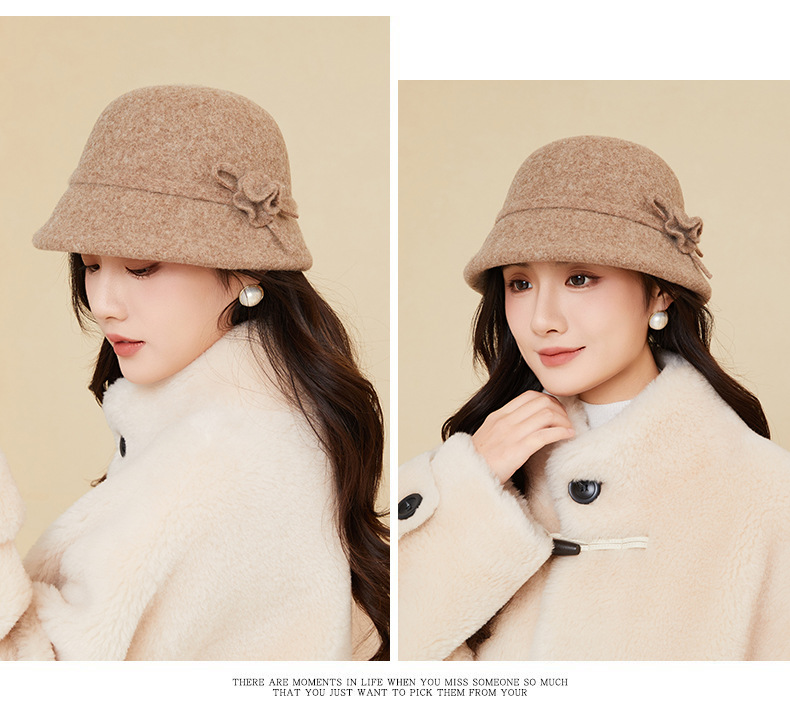 秋冬时尚保暖羊毛呢渔夫帽女系绳花朵礼帽纯色高级感优雅气质盆帽