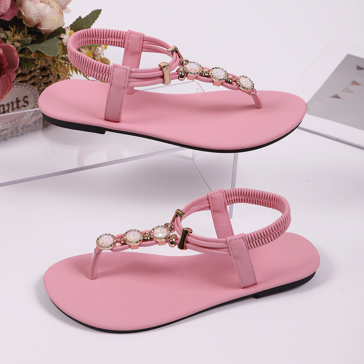 工厂直销潇洒大气沙滩仙女风大码平底平跟圆头民族手工串珠女凉鞋