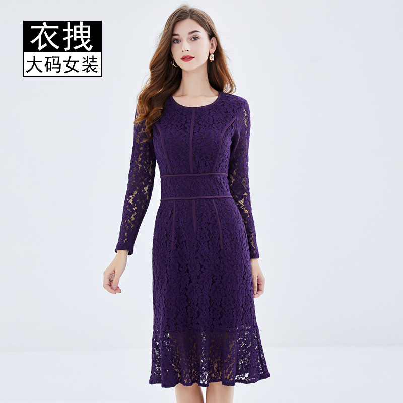 フランスのゆるいブランドのワンピース春秋服の新しい透かし彫りの百合は大きいサイズの200斤の紫色のカジュアルなスカートをプラスします。