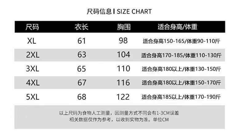 尺码 XL【建议90--110斤】,XXL【建议110--130斤】,3XL【建议130--150斤】,4XL【建议150--170斤】,5XL【建议170--190斤】