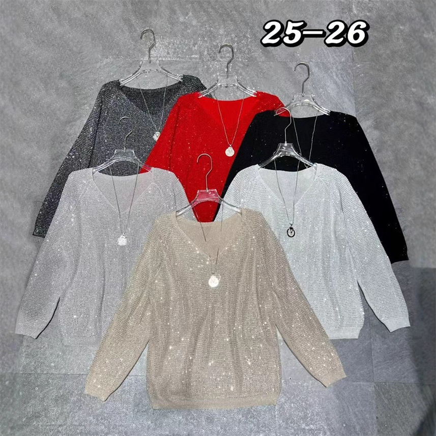 欧美跨境重工烫钻V领长袖针织衫女春秋亮闪闪宽松显瘦薄款打底衫