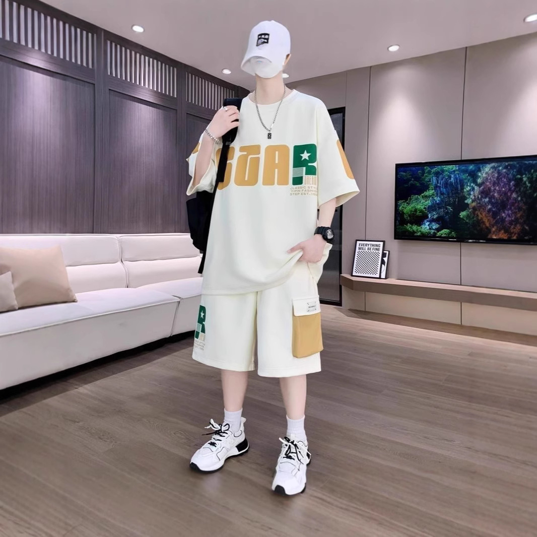 カジュアルスーツ、スポーツスーツ、新しい夏のティーンエイジャーと学生のトレンディな半袖ハンサムなメンズショートパンツスーツ