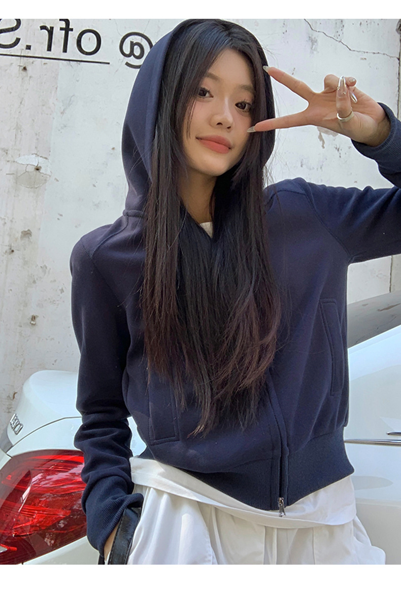藏青色修身短款卫衣外套女秋季新款收腰显瘦上衣韩系百搭运动开衫