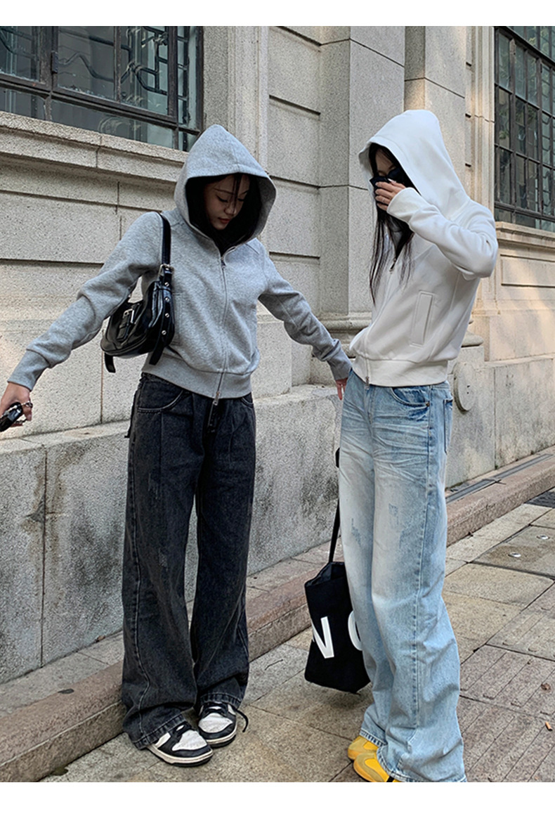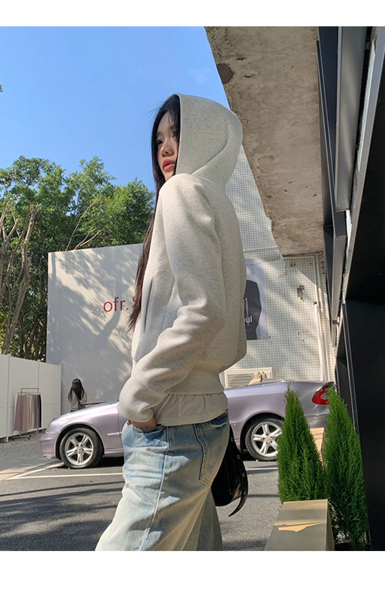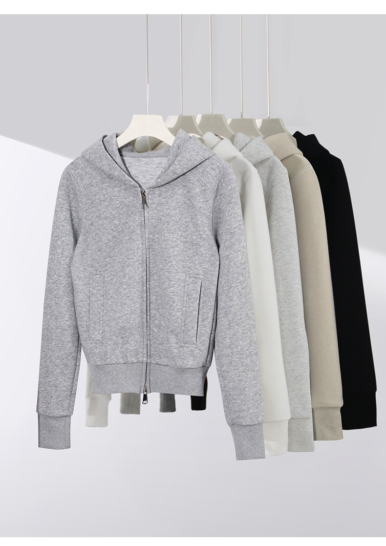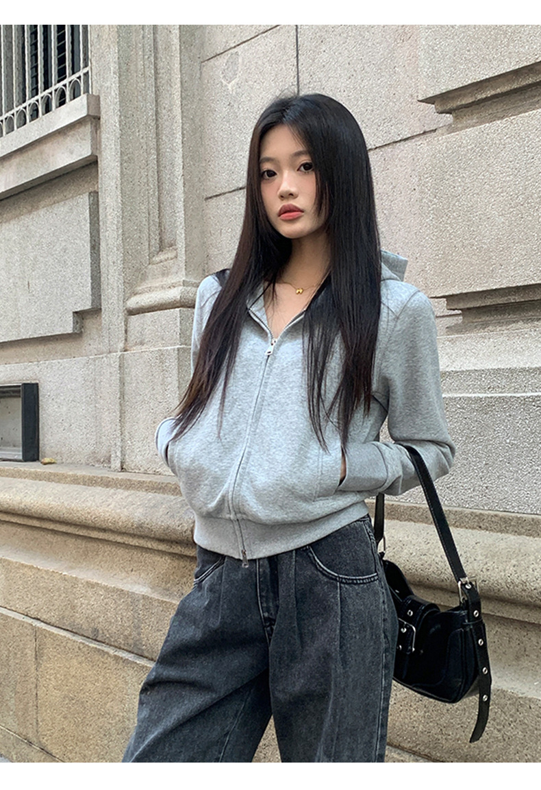 グレーのショート丈ジップアップスウェットジャケット レディース フード付きカーディガン スリムフィット 韓国風トップス アウターセット トレンドスウェット