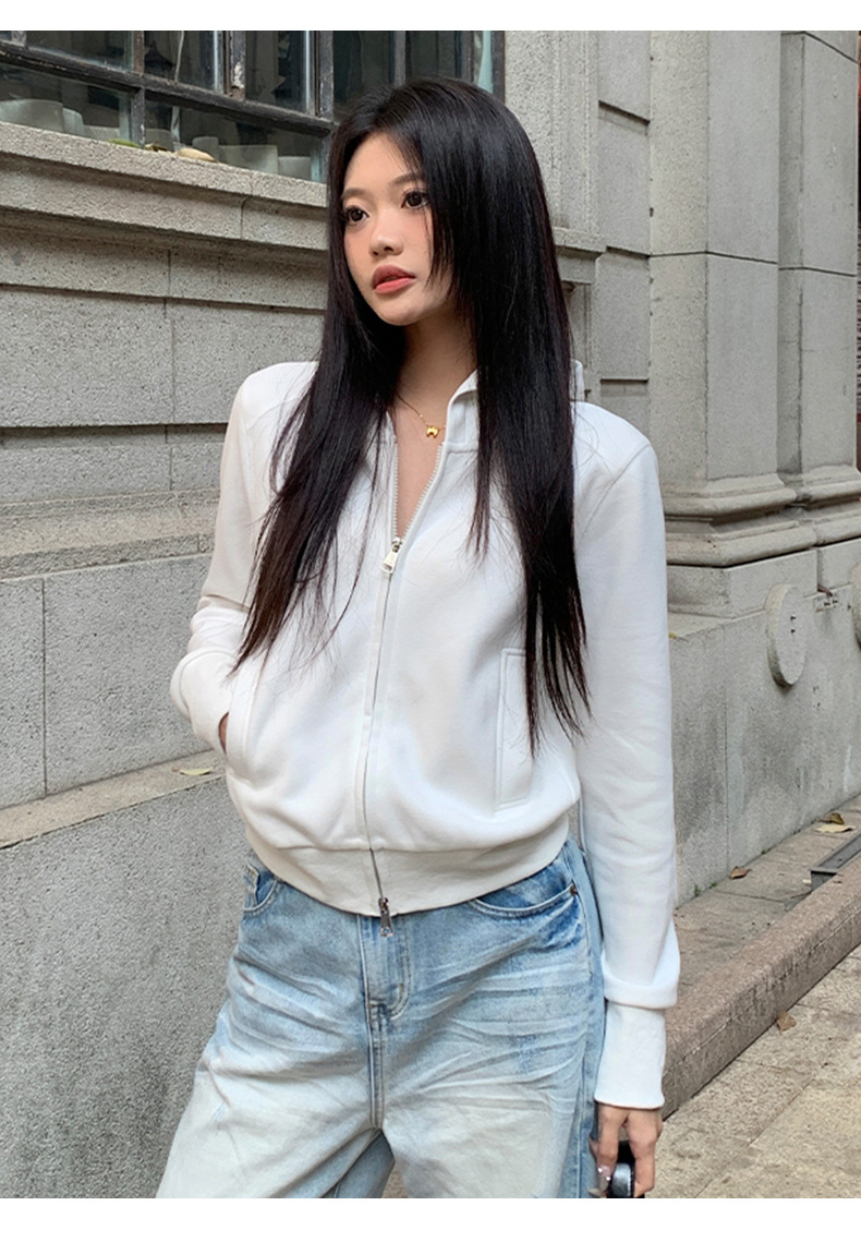 白色连帽短款卫衣外套女开春秋季灰色拉链修身开衫运动正肩上衣薄