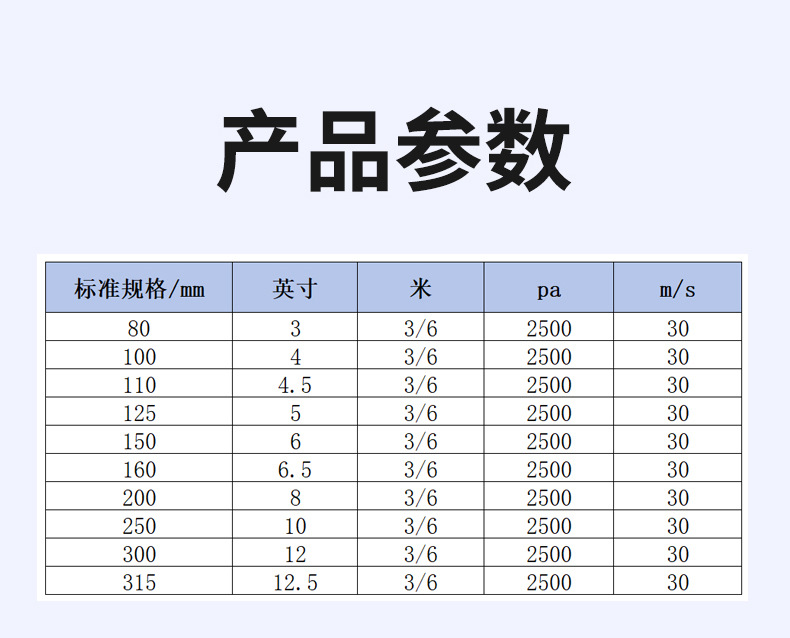 产品规格 3米80黑色加强复合管,6米80黑色加强复合管,3米100灰色加强复合管,6米100灰色加强复合管,8米100灰色加强复合管,3米100黑色加强复合管,6米100黑色加强复合管,8米100黑色加强复合管,3米125黑色加强复合管,6米125黑色加强复合管,8米125黑色加强复合管,3米150黑色加强复合管,6米150黑色加强复合管,8米150黑色加强复合管,3米200黑色加强复合管,6米200黑色加强复合管,8米200黑色加强复合管,65-89MM 卡箍,91-114MM 卡箍,143-165MM 卡箍,194-216MM 卡箍